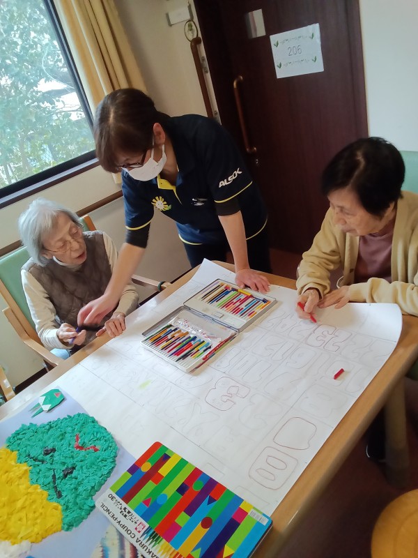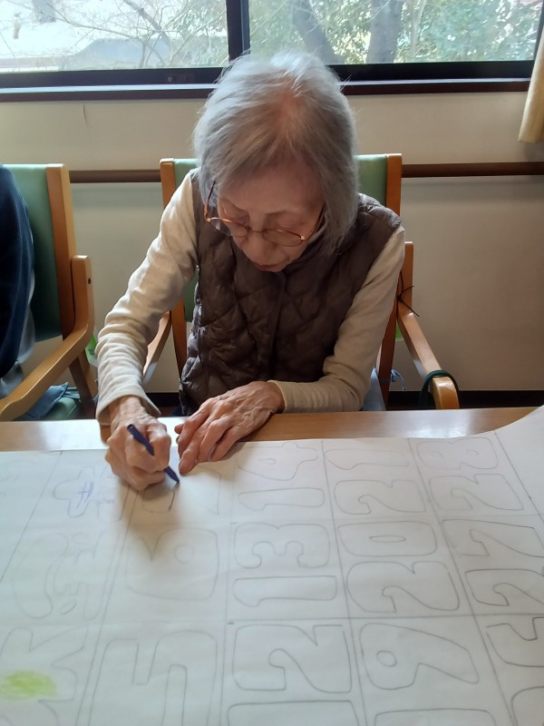 月末になると、松風が誇るNo1デザイナースタッフが下書きしたカレンダーに入居者様が色塗りしてくださいます