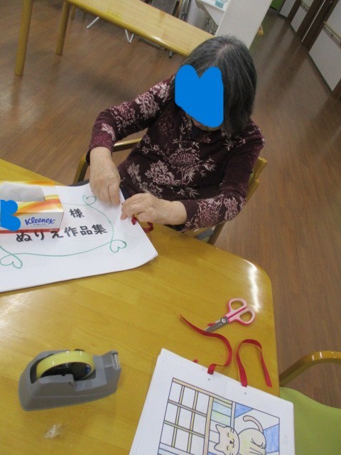 塗り絵の作品を閉じて下さっています( ^ω^)・・・ たくさんの塗り絵ができたかな?? 嬉しそうでした。