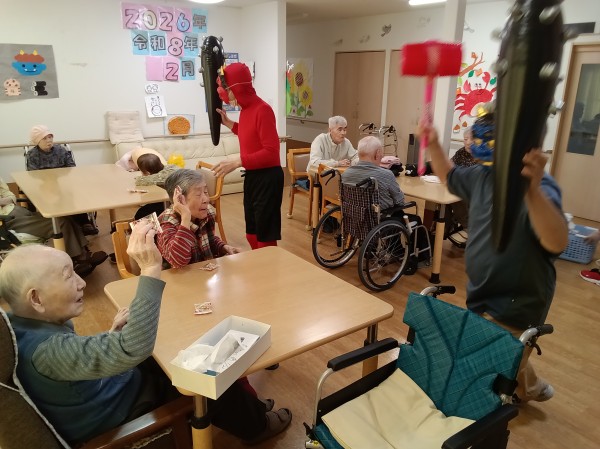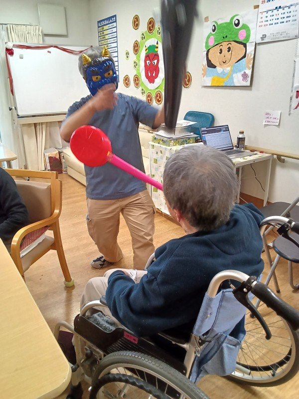 徐々にこん棒やピコピコハンマーを使い鬼退治を始めるご入居者様たち(笑)