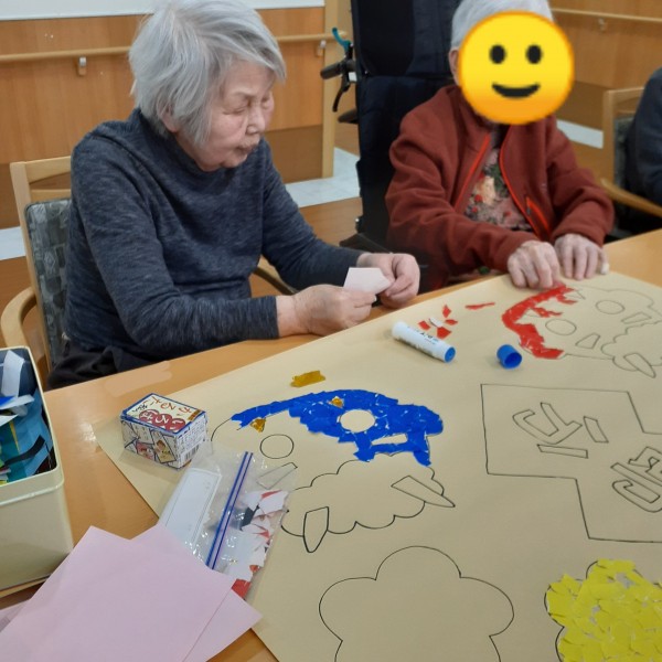 折り紙をちぎり、のり付けをして