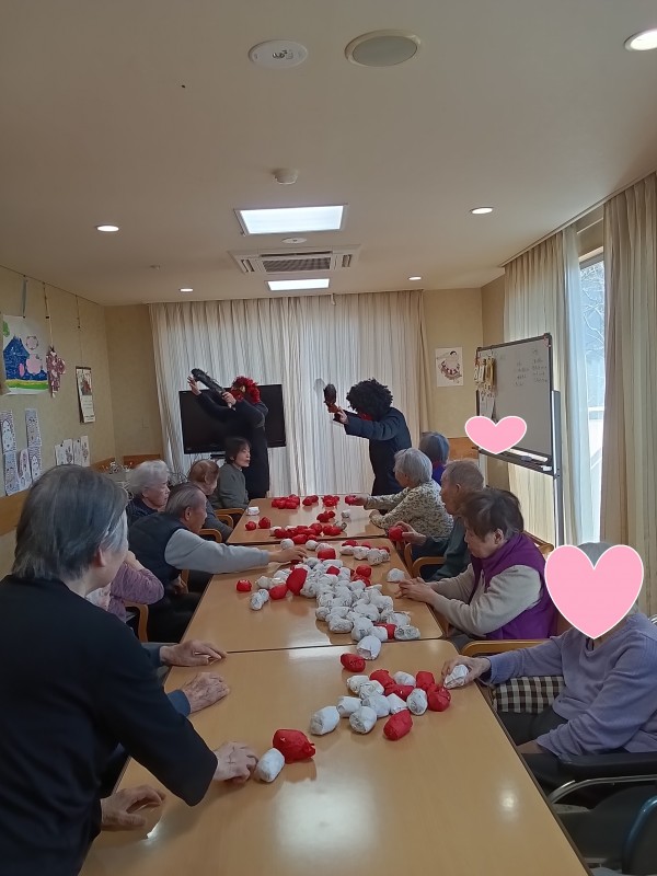 なまはげのような姿に皆さんは驚きつつも笑顔で楽しまれていましたが遊びに来ていたホーム長のお子さんは迫力ある鬼に「やだよ~怖いよ~」と思わず涙するい一幕もありました。小さい子には、なかなか迫力のある鬼だったようです(泣)