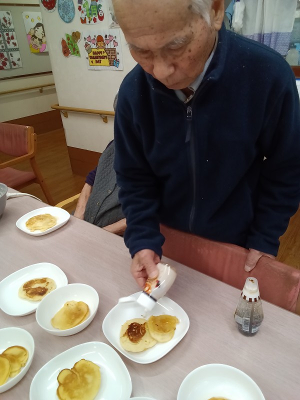 1階ご利用者様、おやつのホットケーキ作りをされました。