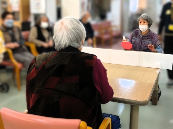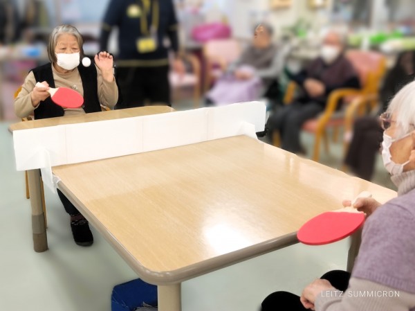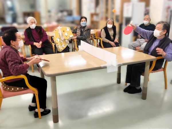 職員お手製の仕切りボードをネット代わりにテーブルに設置してピンポン玉を打ち合っていただきました♪