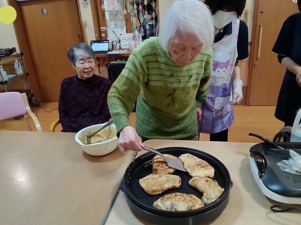 ホットプレートを囲み、数名のご利用者様に「ひっくり返し」をお願いしたところ、「任せて!」とお見事な手つき♪
