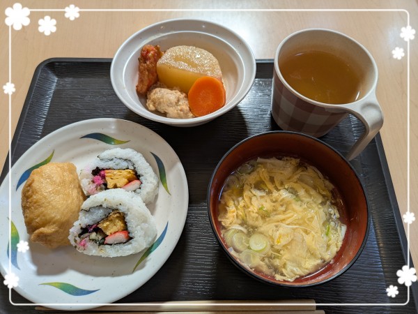 のり巻き、お稲荷さん、大根と鳥団子の煮物と、かきたま汁~