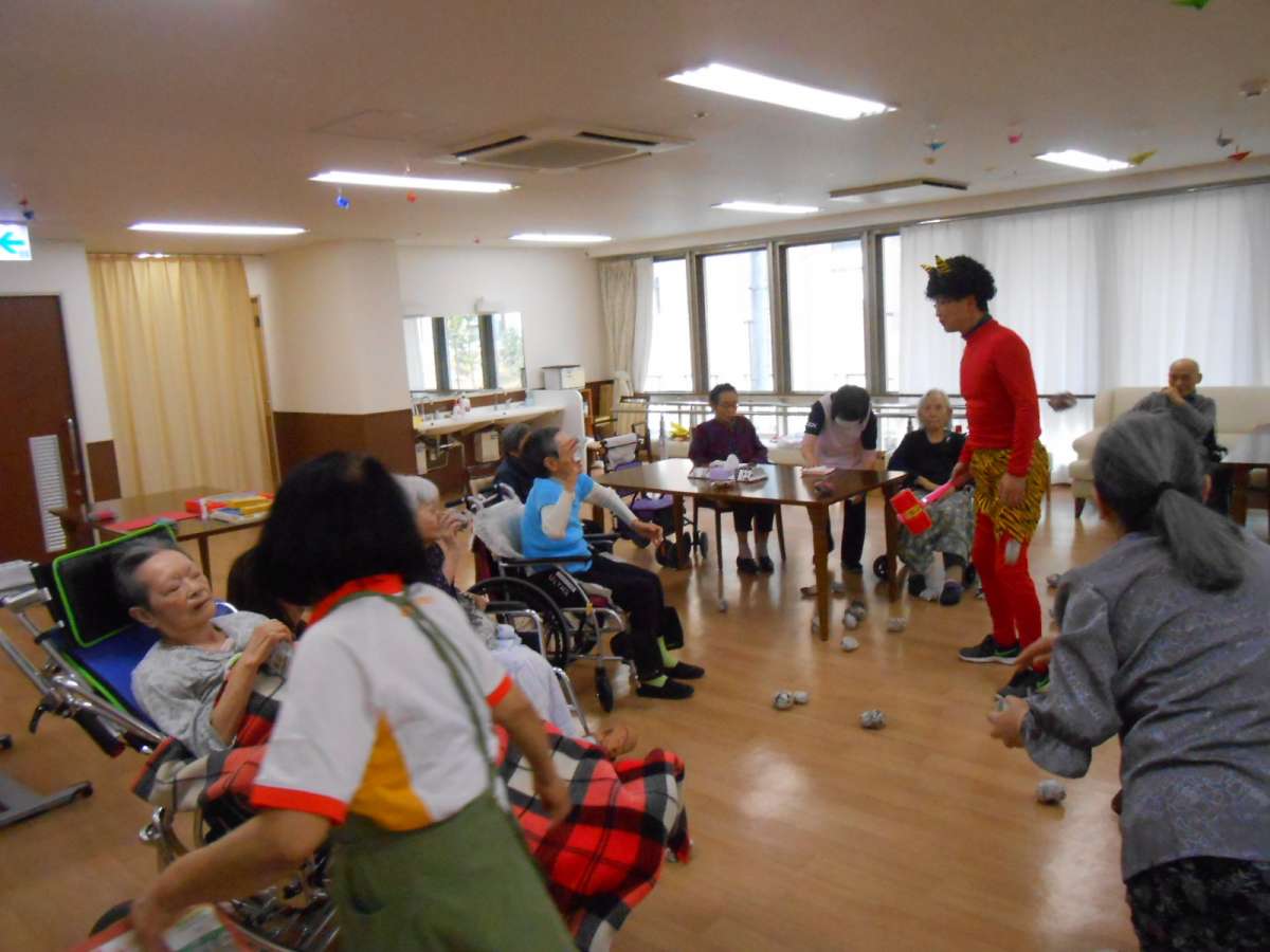 ご利用者様は待っていましたと新聞紙を丸めた豆?を鬼めがけて勢いよく投げ、「鬼は外」「鬼は外」と元気な声を張り上げ、鬼を撃退しました。