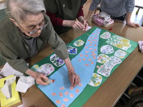 春が待ち遠しい季節になってきました。本日は「花」(民謡)を歌いながら、皆で川を作り、お花もたくさん作りました!