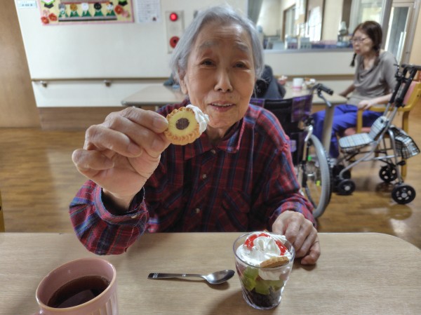 職員がパフェを皆様の前で調理し、皆様早く食べたそうに眺めて