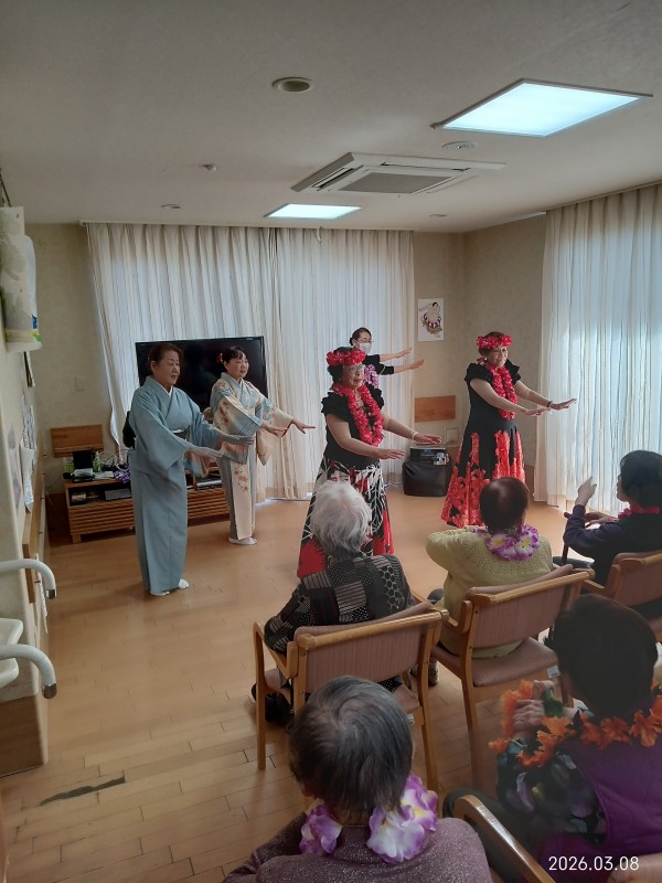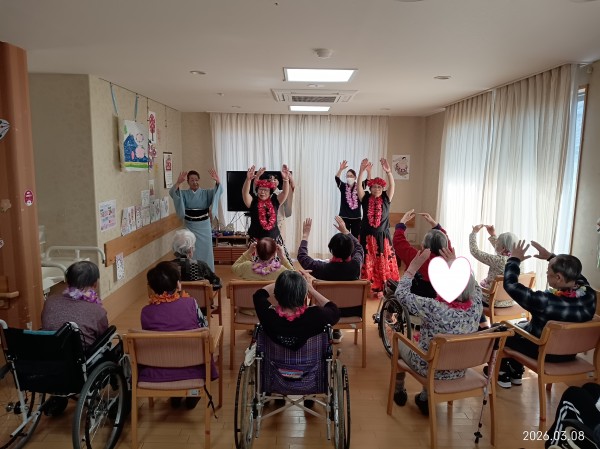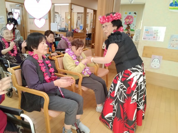 フラダンスではゆったりとした音楽に合わせてご利用者様も口ずさまれながら一緒に手や体を動かして楽しまれるご様子がありました。