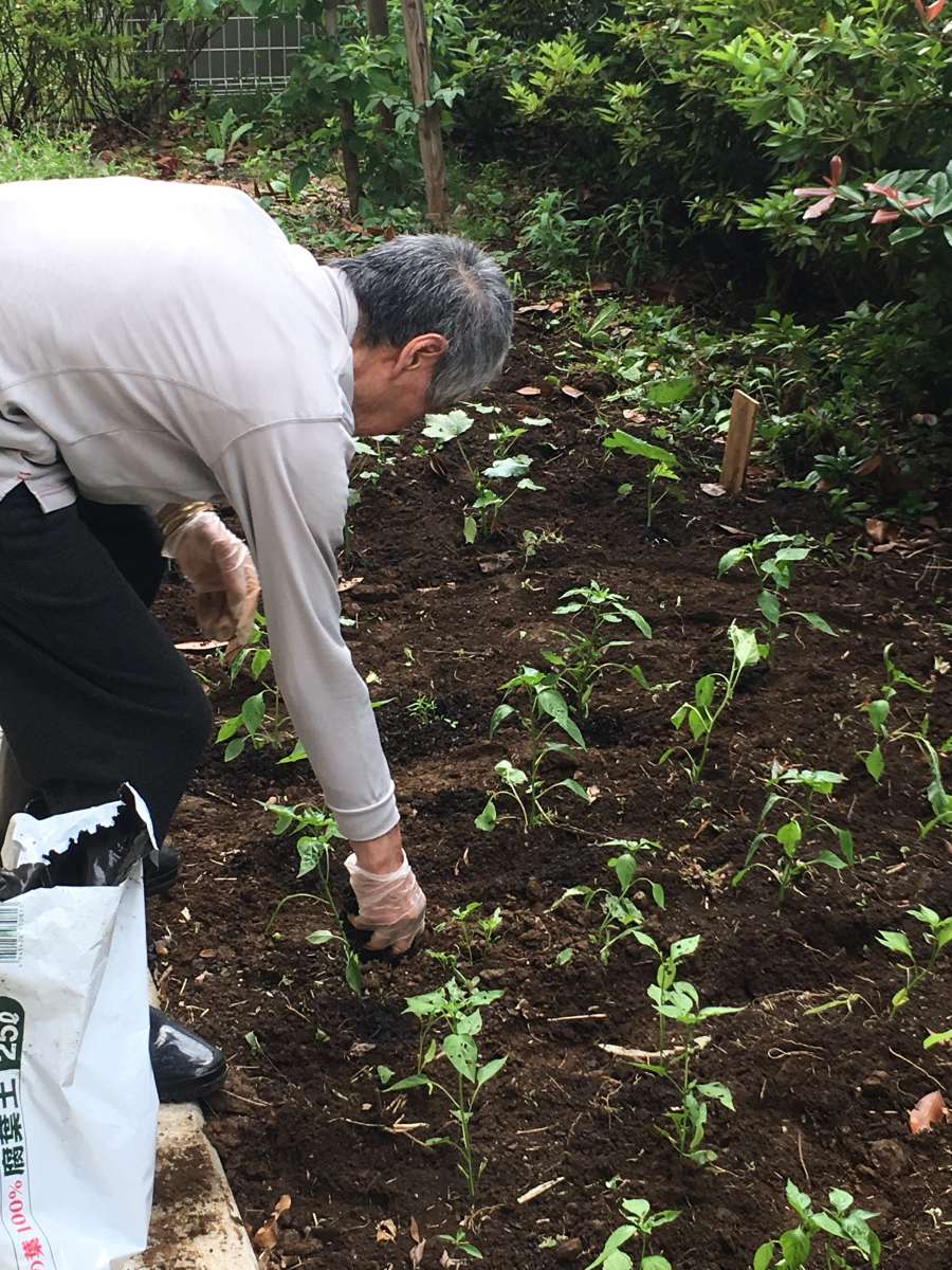 6月28日台風の影響もなく小降りの早朝から入居者K様、長靴履いて鍬を手に土を耕していました。