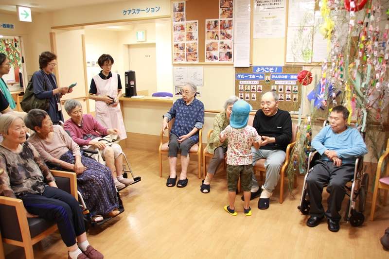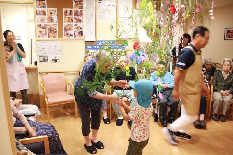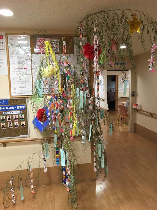 今日は、グループホームみんなの家 西東京です。昨日は七夕様でしたが、東京は雨模様で残念ながら、居り姫様彦星様は、観ることはできませんでした。ご利用者様は、早くからお願い事を、短冊に書いて吊るしてありましたがどのくらい願いがかなったでしょうか?願い事の第1位は、やはりおいしいものを食べたい。お寿司が食べたいと言う願いが多かったので、7日の日に昼食のメニューはソーメンだったので、ソーメンをお吸い物にして、五目ちらし寿司にして皆様に召し上がっていただきました。また、7月4日に、ご近所のきたしば保育園の園児さんと先生が、七夕飾りを持って訪問してくれました。この日も雨模様で、2人の園児さんでしたが、お爺ちゃんやお婆ちゃんは大喜び、七夕様の歌を皆様と一緒に歌い、帰りがけに皆様と握手電車でご利用者様おひとりずつ握手をし、バイバイしました。