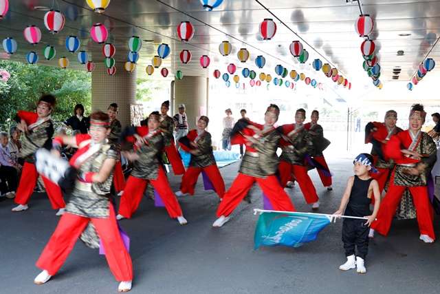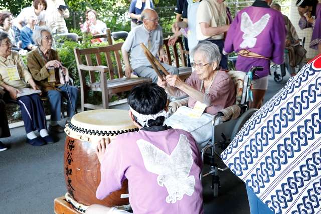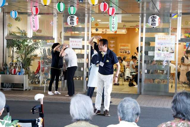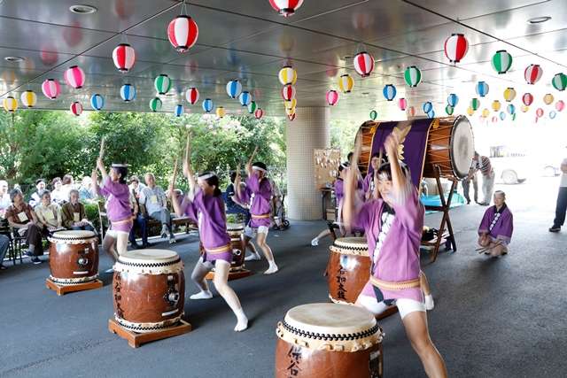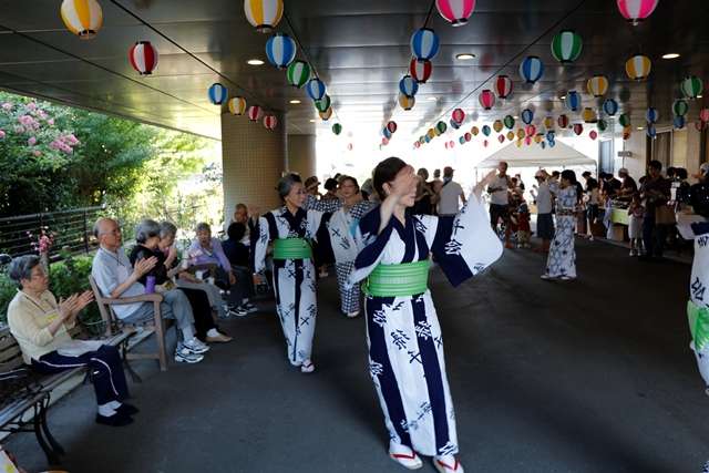 少しお祭りの様子を紹介いたします。アイキャッチ画像と、写真上段左は、田無ソーラン会の皆様による見事な演舞です。この時期、各地で演舞を披露され多忙な中、毎年のお約束として今年も祭りのスタートを飾ってくださいました。今年は幼稚園年長さんが旗手として参加され、その可愛らしさにより一層盛り上がりました。真中は、ウイズネットの岡田トレーナーによるNOAエクササイズです。1Fエントランスと、屋外の会場の皆様を同時に盛り上げてくださいました。右は出店の様子です。今年は、昨年よりさらに種類が増え、大好評でした。下段左は、勇壮な保谷和太鼓のみなさまによる太鼓演奏です。暑さの中、会場の空気が一瞬で変わる迫力ある演奏です。玉のような汗を額に、全身全霊での演奏は素晴らしいの一言です。真中はすこや家のご利用者様です。今年100歳のご長寿様です。バチさばきが軽快です。右端は緑千会の皆様による盆踊りです。踊りが始まると、一人のご利用者様が輪の中に入られました。今年1月までこの踊りの会の会長さんだった方です。普段はシルバーカーでの歩行、踊りが始まると姿勢がよくなり慣れた手つきで踊られました。一緒に踊られたご家族様が心配そうにでもうれしそうな表情をされていたのが印象的でした。