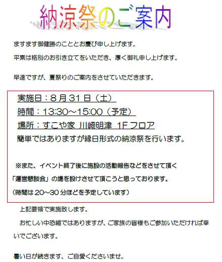 【すこや家】納涼祭のご案内【川崎明津】