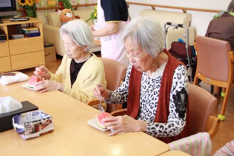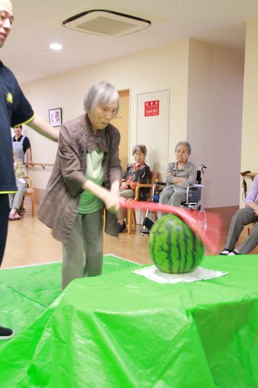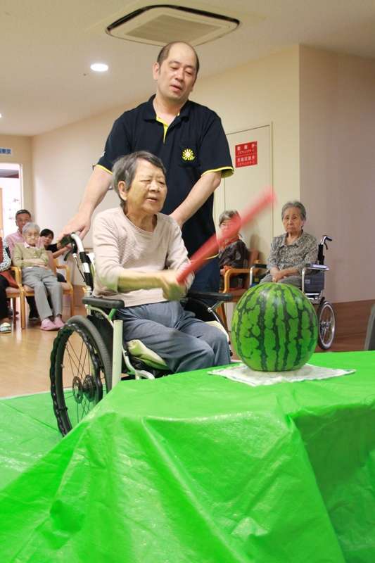 今日は、グループホームみんなの家 西東京です。猛暑の中納涼祭が終わり、ご利用者様達の体調も気にしながら、8月10日に、グループホームとショートステイ西東京の合同スイカ割り大会が行われました。昨年はちょっと遅くなり、スイカの金額がものすごく高く大変だったので今年は、7月の行事に組み込んだのは良かったのですが、梅雨がなかなか明けず、スイカ割りにはちょっと向かなかったので、8月の行事になりました。納涼祭の後だけに、疲れていないかと心配しつつスイカ割り開始、目隠しをしないでのスイカ割りなので、1人目で割られると終わってしまうため、丁度良い棒を探すのが、一苦労朝から棒さがし、やっと間に合わせた棒を振りおろしエイヤー無傷のスイカでした。約25人のスイカ叩きゲームを終了各フロアーに帰りスイカを召し上がっていただきました。ユニット1の皆様は、すいかにかぶりつきものすごい勢いで召し上がって居られました。ユニット2のご利用者様のほとんどが、スプーンを使い上品に召し上がって居られました。この違いは、何?と大笑いの職員たちでした。