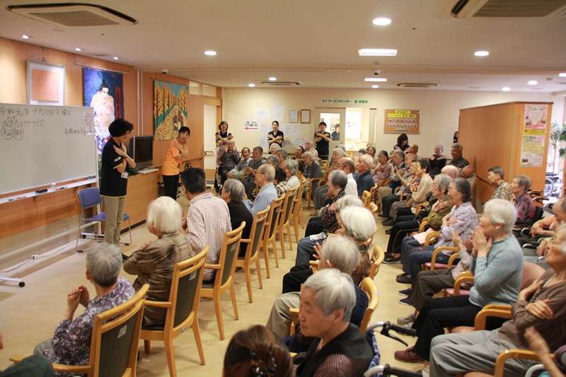 今日は、グループホームみんなの家 西東京です。やっと涼しくなったなー!と思ったら台風15号関東直撃、東京湾を通り千葉、茨城を通りまた太平洋に抜けましたが、あちらこちらに大きな爪痕をのこしていきました。被害にあわれた皆様大変でした、お大事にしてください。さて毎月第2火曜日、NÕAエクササイズです。一昨日の台風のことは、一部の方が覚えて居られるだけで、皆様毎日毎日、クリアーされ新しい日々を過ごされておりまして、本日のNÕAエクササイズも笑顔がいっぱいの楽しい1時間でした。本日も60名位の方々と各フロアーの職員が参加し皆様のお手本になるよう恐る恐る前に出てエクササイズを楽しまれました。本日の先生は、高橋 亜佐美先生です。