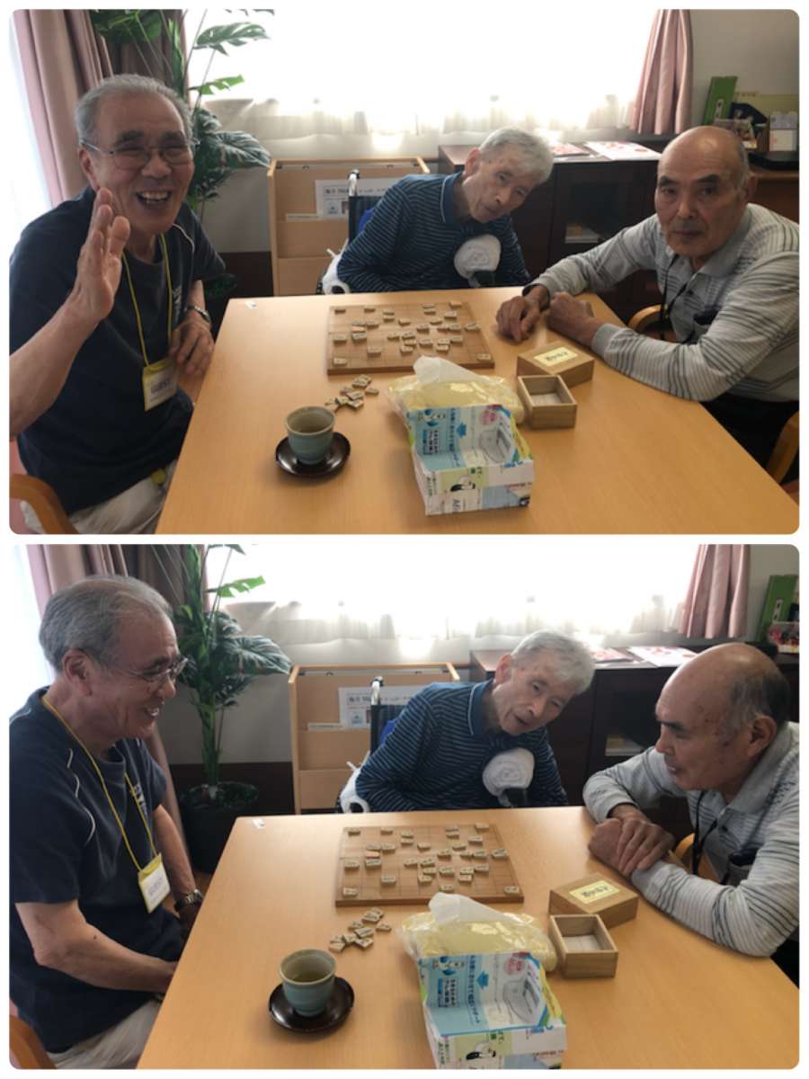 そして、入居者N様のご友人が面会に来てくださり、将棋好きな男性入居者様達が集まってこらました。『なるほど〜。そうくるんだ』など、お話が盛り上がっていましたよ。今日も賑やかな二階フロアのご様子でした(*^^*)