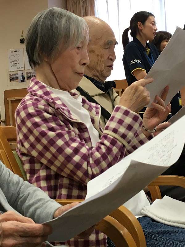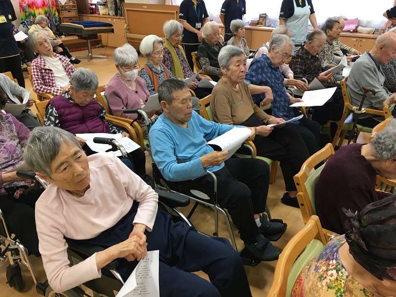 さて、グループホームの皆様は、10月26日にデイサービスさんからのご招待で、芝三寿会(しみずかい)と読みますこの施設のご近所の方々で、コーラスをされている皆様方です。今回は「懐かしい風景を思い出しながら秋の歌を唄いましょう」と言う事で、秋の歌を皆様と一緒に16曲と会の皆様だけのコーラスで、4曲と手話を交えた歌を2曲披露していただきました。ご利用者の皆様は、歌詞カードを見ずに、大きな声で歌いながら涙しておりました。