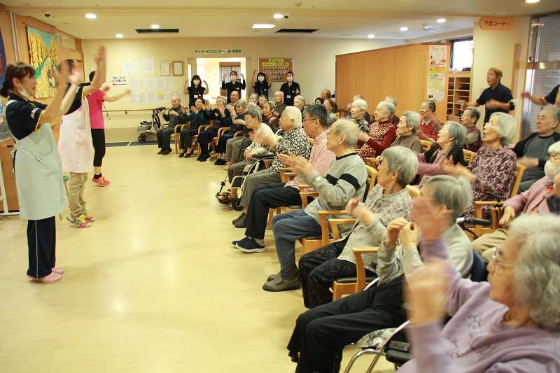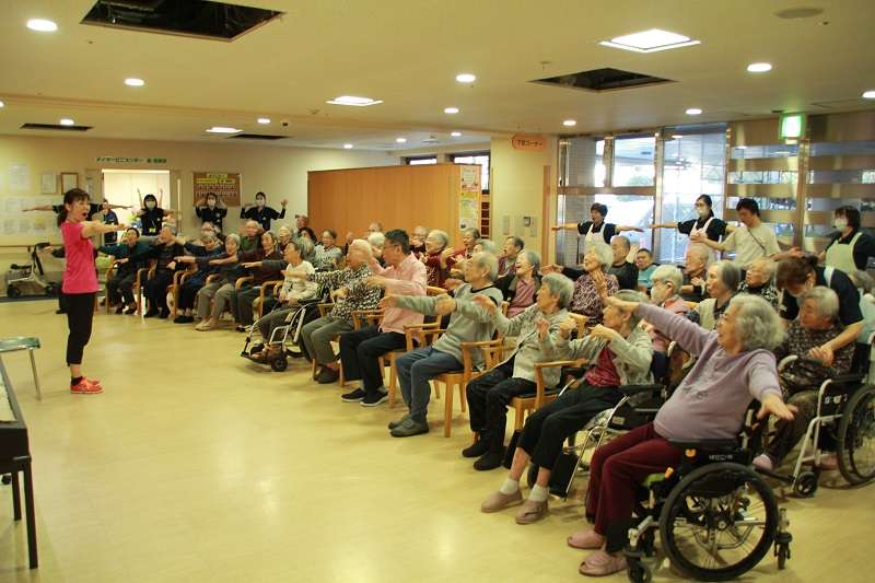 こんにちは、グループホーム みんなの家 西東京です。11月8日は、立冬でしたね!朝晩かなり寒くなってきました。今ここの施設、外向とエアコン工事が入っていて、共有部や各居室のエアコンが新しくなっております。居室のエアコンは、交換が終わるとすぐに可動するのですが、共有部の大きなエアコンは、屋上の室外機につなげるため全部のエアコンがとりつかないと動かないので、朝晩皆様、ちょっと厚着になってきました。もう少しで終わりそうですそれまで少しの我慢です。さて、本日は、月の第2火曜日、NŌAエクササイズの日です。1階のエントランスに、各施設のご利用者様(本日は、42名の参加)が集まり、無理なく少しづつ体をほぐしながら指先から全体に血流を良くする運動を約50分皆様いつもニコニコしながら、時に大きな声で笑い、おなかから声を出し終わるころには皆様のホッペがリンゴのように赤くなりました。12月は10日です。今年最後のNŌAエクササイズになります。どなたでも参加できます。無料です。すこや家 西東京に12月10日 14:00~です。どうぞご参加ください。お待ちしております。