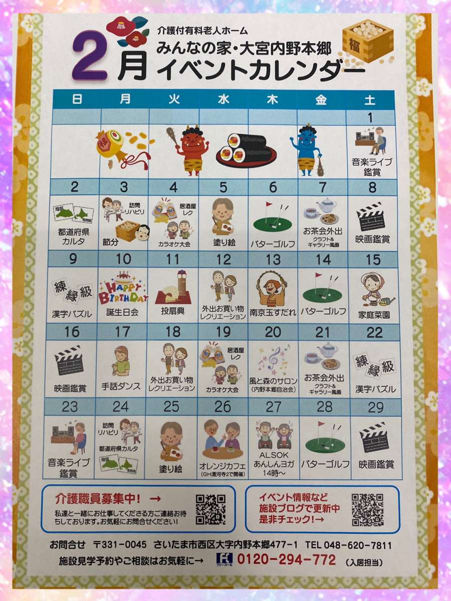 こんにちは。みんなの家・大宮内野本郷の国藤です(^。^) 花の丘公園そば。さいたま市西区。 宮原駅西口よりバス6分&徒歩4分のところにある施設です。 来月のイベントカレンダーが出来上がりました☆ カラオケ大会・カフェに行こう♬・お買い物レク・自治会サロン・安心ヨガ・手話ダンスボランティア様などなど、、、2月も盛り沢山な内野本郷です♬ 入居者様に喜んでいただけるよう、来月もスタッフ一丸となり盛り上げて行きたいと思います(^。^)お気軽にご見学等、お待ちしております。