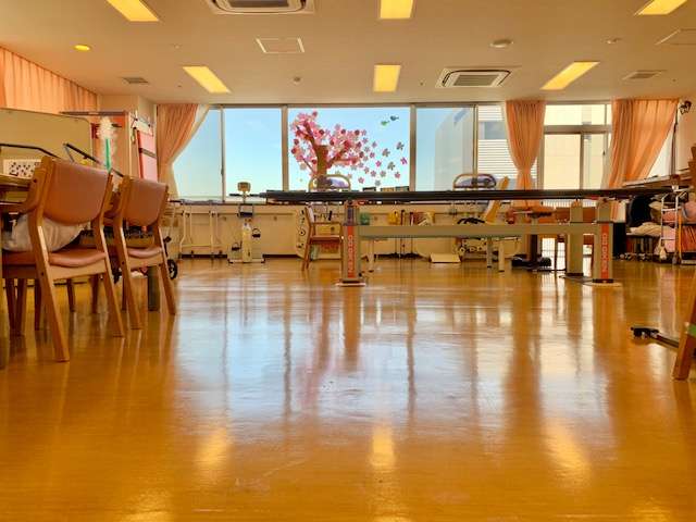 デイサービスセンター遊・新横浜は、建物の3階にあり、フロアの全面に大きな窓ガラスがあり、日差しがとても当たり明るいフロアです。