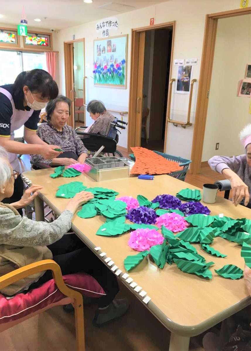 今回は今月行いましたレクレーションの「紫陽花の花作り」をご紹介いたします。