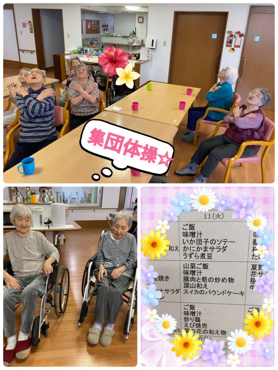 暑さに負けず☆本日も、昼食前にしっかりと30分間『集団体操・口腔体操・早口言葉・音楽体操』を行いましたよ(^。^)