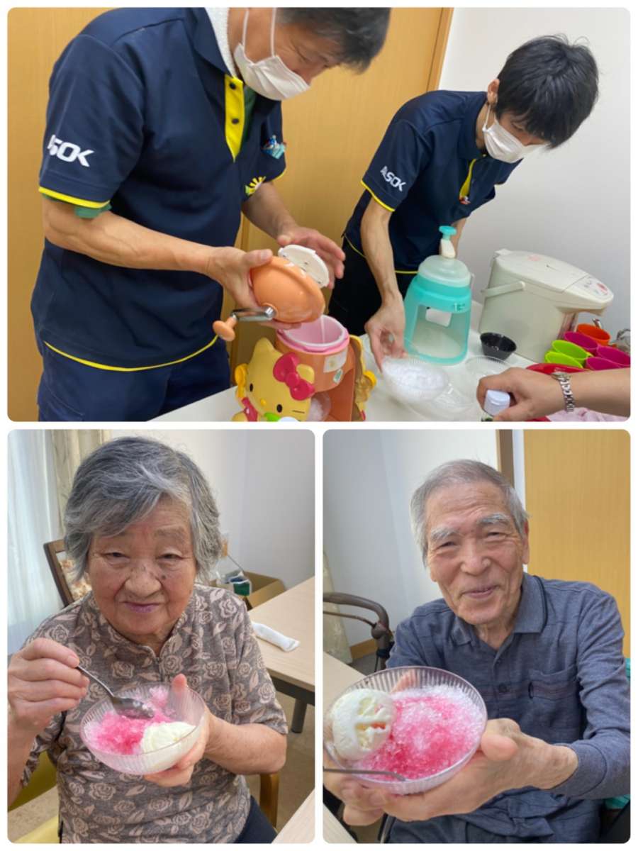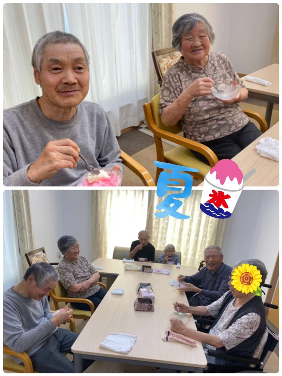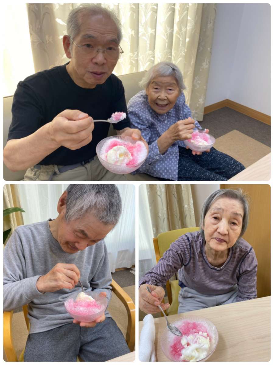 こんにちは。みんなの家・大宮内野本郷のコダマです(^。^) 花の丘公園そば。さいたま市西区。 宮原駅西口よりバス6分&徒歩4分のところにある施設です。 今日も厳しい暑さでしたね。コロナ渦ですが、密にならない場所ではたまにマスクを外し深呼吸したり、こまめに水分を取って『熱中症』に気をつけましょう。 今日は皆さまお楽しみな♬一階と二階の入居者様との交流会を行いました(๑˃̵ᴗ˂̵) 夏の風物詩といえば・・・かき氷♡♡♡ スタッフ汗をかきながら、入居者様の笑顔のために♡頑張りましたー♬ 入居されたばかりのお二人のご紹介も兼ねて☆賑やかなご様子(^。^) 『かき氷なんていつ以来かしら♡』『懐かしい味!』『私はメロン味にしてー♬』と、沢山の笑顔が見られましたよ(^。^)またやりましょうね〜(^。^)♪