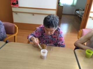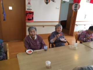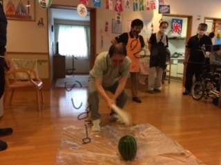 もちろん割れたスイカは職員が頂きまして入居者様は冷やしたスイカを食べました。