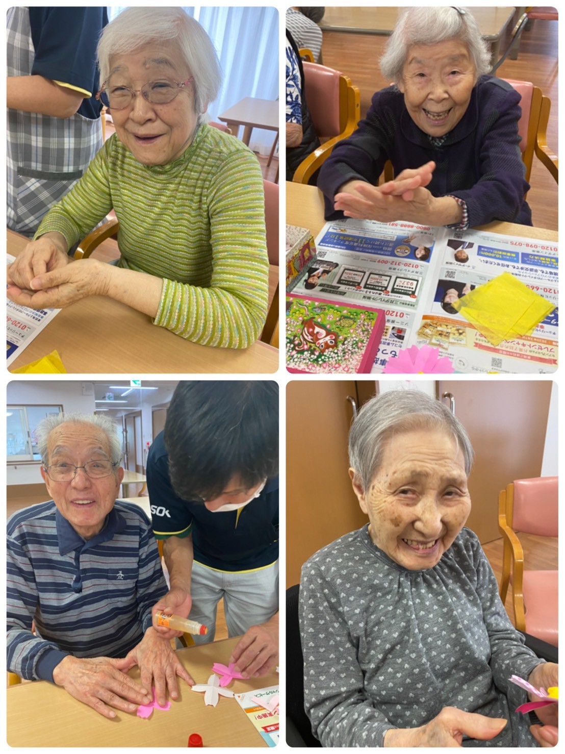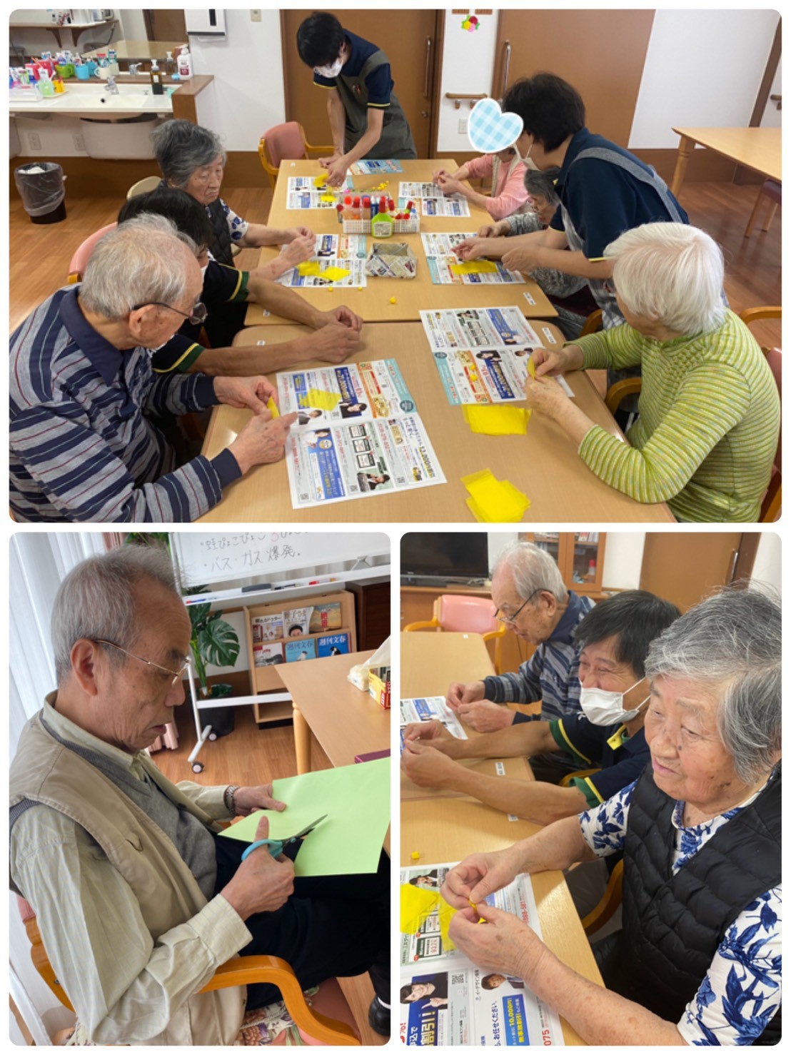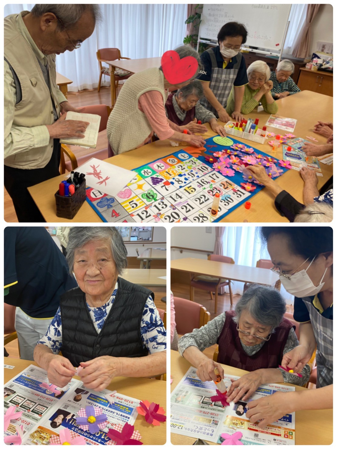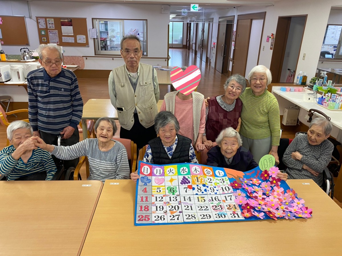 こんにちは。みんなの家・大宮内野本郷のコダマです(^。^) 花の丘公園そば。さいたま市西区。 宮原駅西口よりバス6分&徒歩4分のところにある施設です。 先月の『創作レク』のご様子です(^。^) 二階フロアでは、フロアに飾る『10月の巨大カレンダー創作』の続きを行いました(๑˃̵ᴗ˂̵) ◉型紙を利用し、切り出した折り紙の花びら二枚をずらして、中心を糊付けする。 ◉黄色いお花紙を丸め形を整え、お花な中心にボンドで貼る。 ◉大きな模造紙に、、、日付部分やコスモスのお花、切り抜いた人物やトンボなどを、バランスを考えながら貼っていく。 テーマは『コスモス畑』です(^。^) 素敵な作品に仕上がりましたね。 手指を動かし巧緻性の維持・向上を図る。季節のお花を作ることにより今を意識する。同席の方々とコミュニケーションを図ることを目的としています。 『秋だねぇ♬美味しい果物が食べたいね』『飾るのが楽しみね』など、会話も弾まれていました♡ ↑『集団体操・口腔体操・早口言葉もしっかり行いました♬』