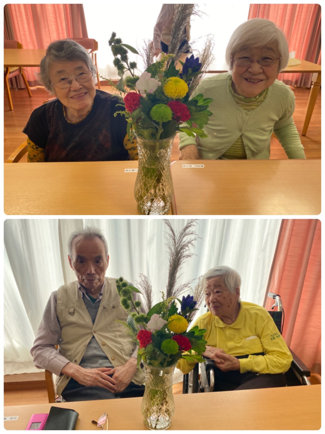 秋がやってきて♡どんどん空が高くなり雲が綺麗に見えたり空気が澄んでいきますね。 先日の『中秋の名月☆』、皆様は『お月見』されましたか(^。^) 我が家のバルコニーからも、まんまるなお月様☆を見ることが出来ました♬本当に綺麗でした♡ お月見団子を作ったりススキを飾ったり、お月見ならではの『日本の楽しみ方』がありますね☆ 本日の二階の入居者様方のご様子です(๑˃̵ᴗ˂̵) 『やっぱり生のお花やスズキはいいねぇ♬』と、沢山の笑顔が見られました♡