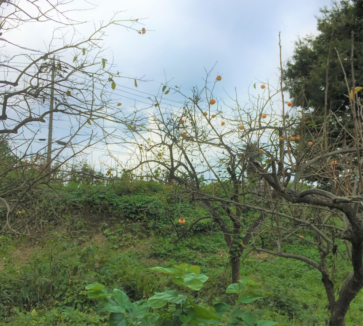 「柿が成っているね」「ちょっと小さいねー」「今年は天気が悪かったからかな?」