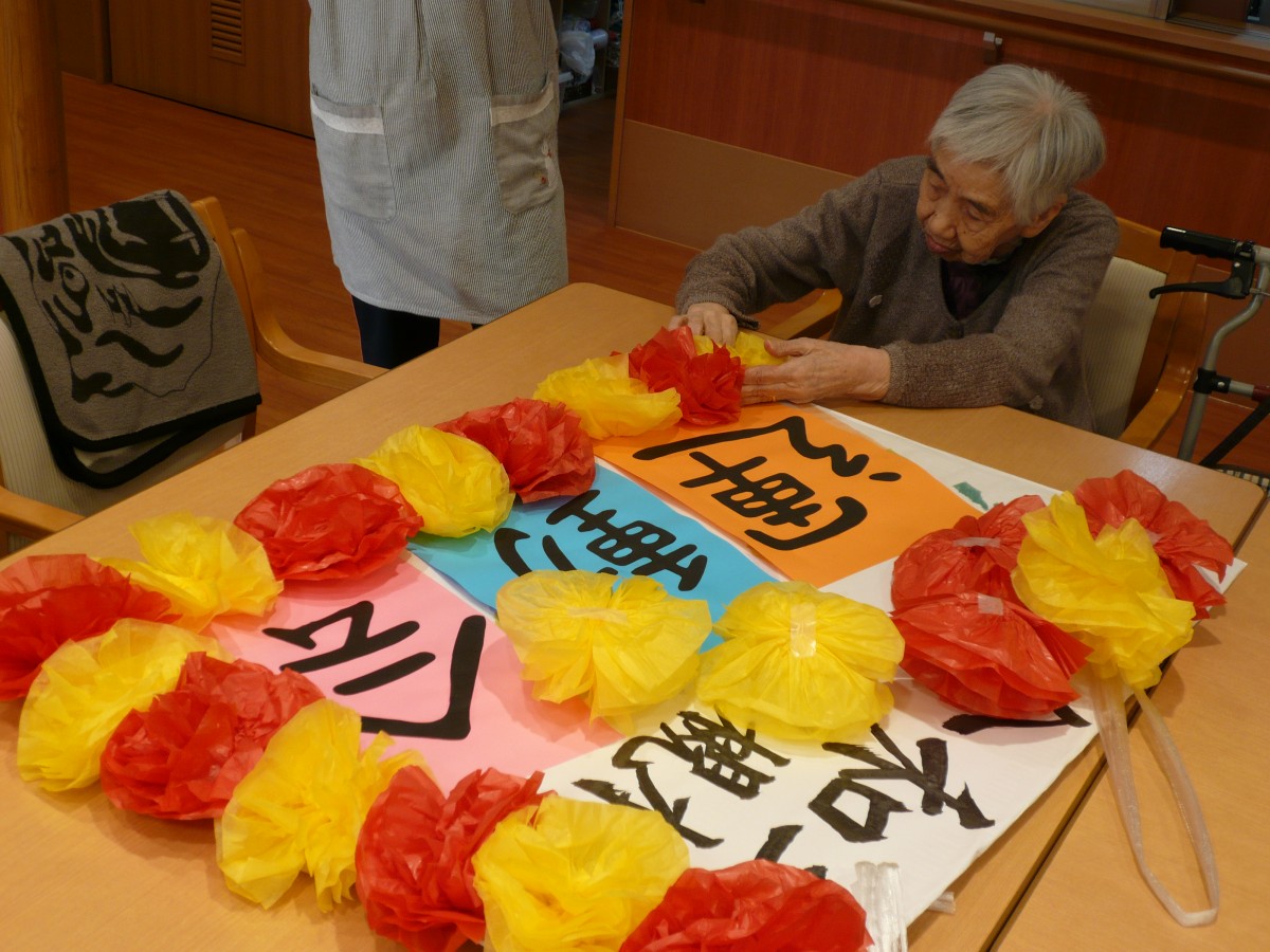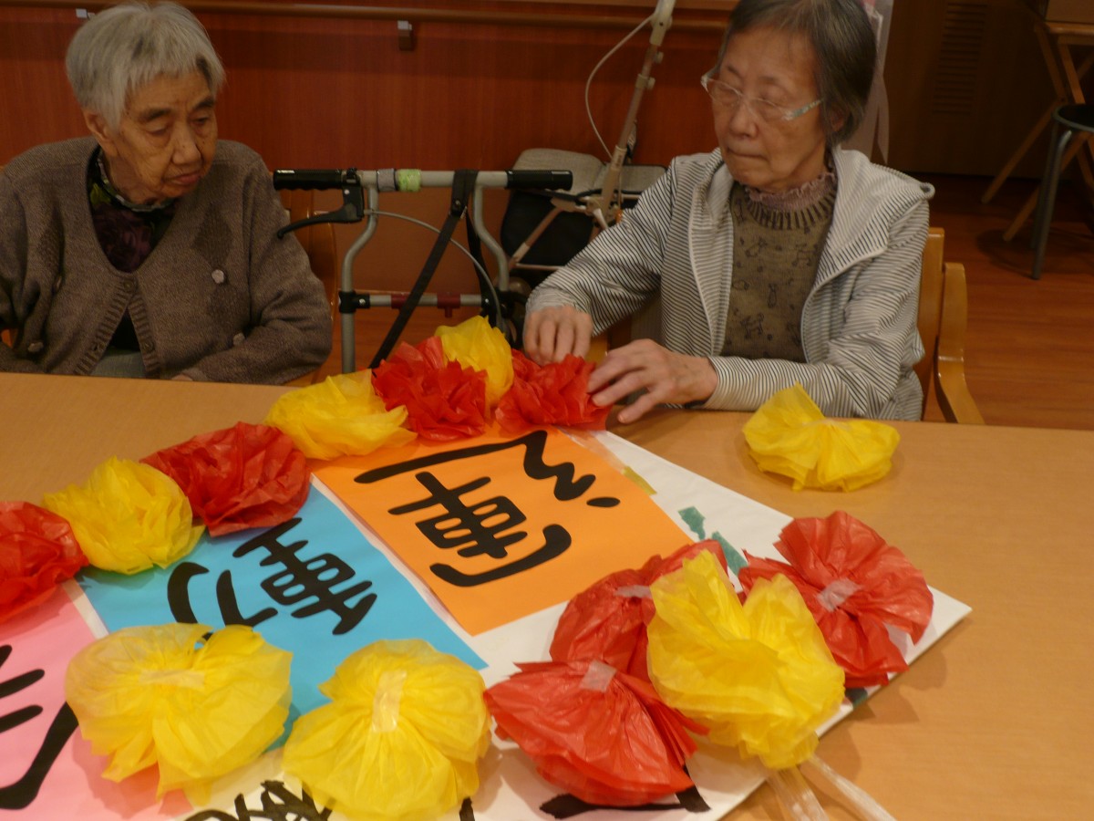 皆様、おはながみを広げて頂き周りに貼っていく作業をして下さりました!