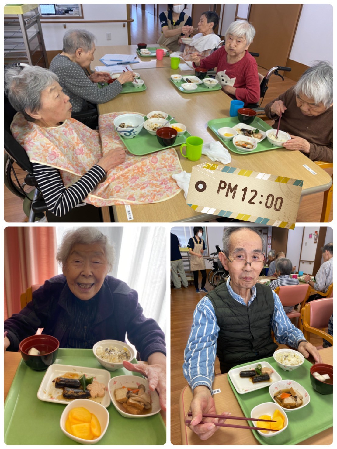 今日のお昼は特別メニュー☆でしたよ(๑˃̵ᴗ˂̵) 『集団体操・早口言葉・口腔体操』をしっかり行ってから☆ 『サツマイモご飯、懐かしい!』『柿は今年初めて食べるよ』と、皆様賑やかに召し上がっていらっしゃいました(^。^)