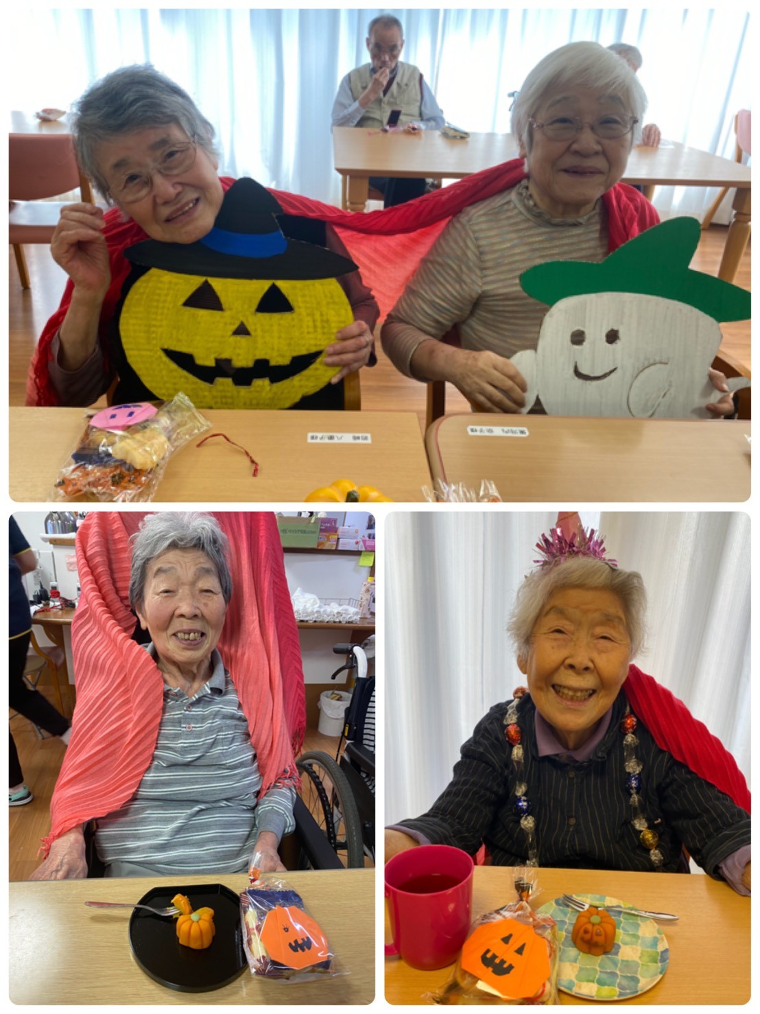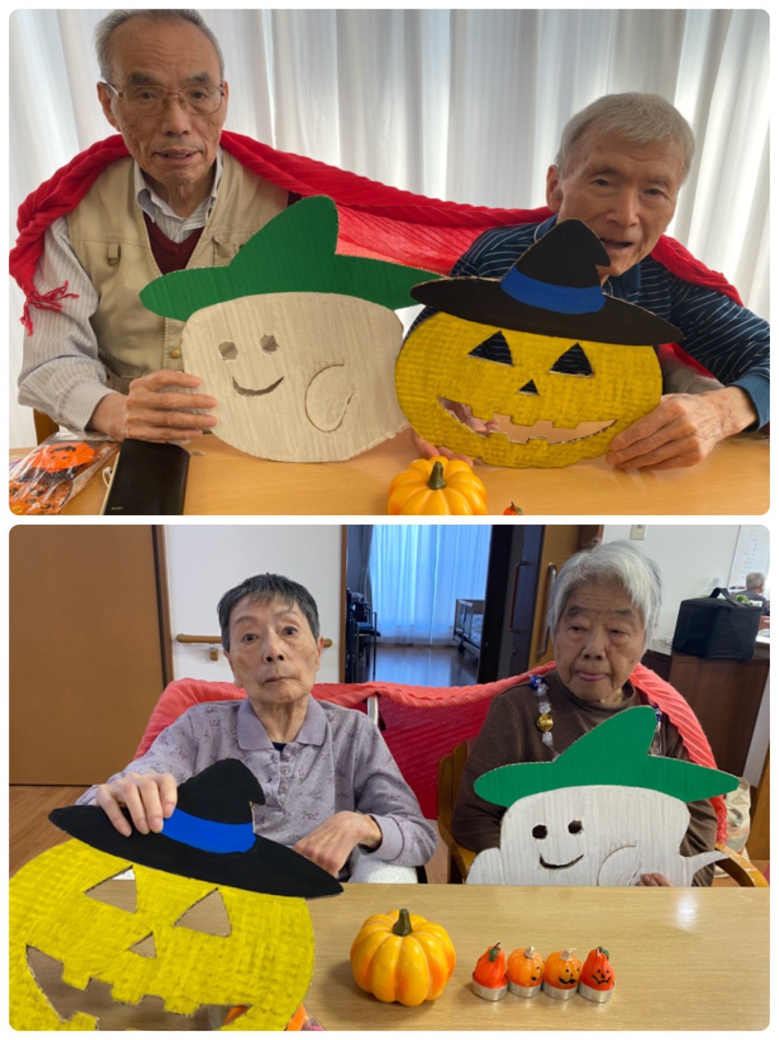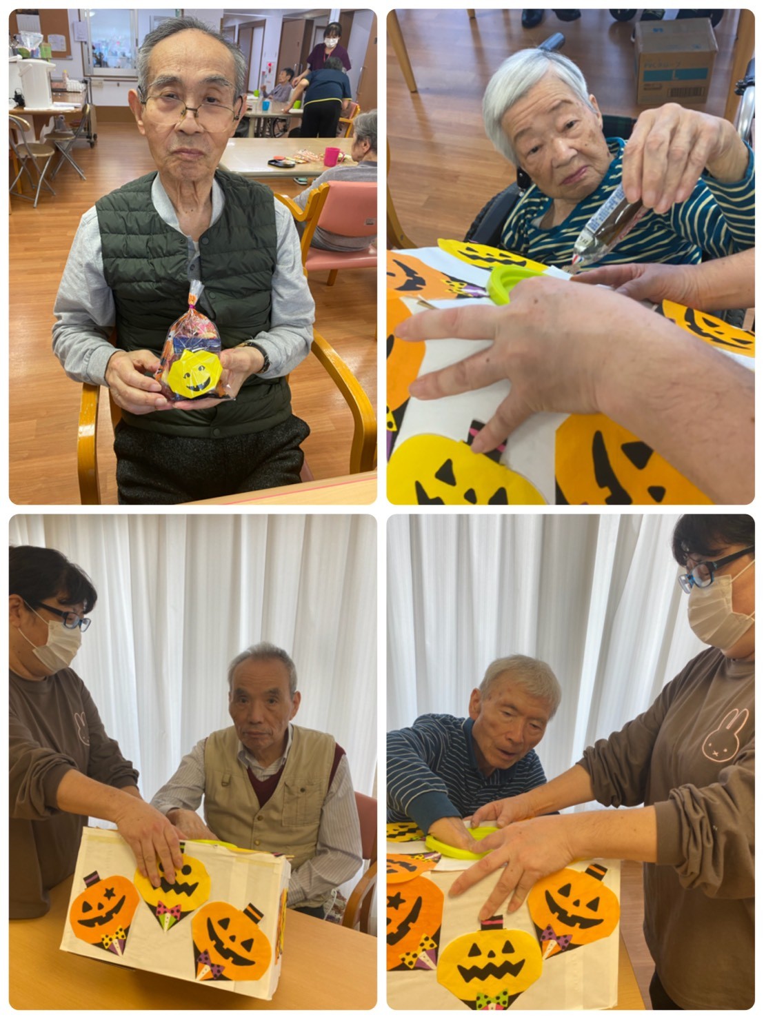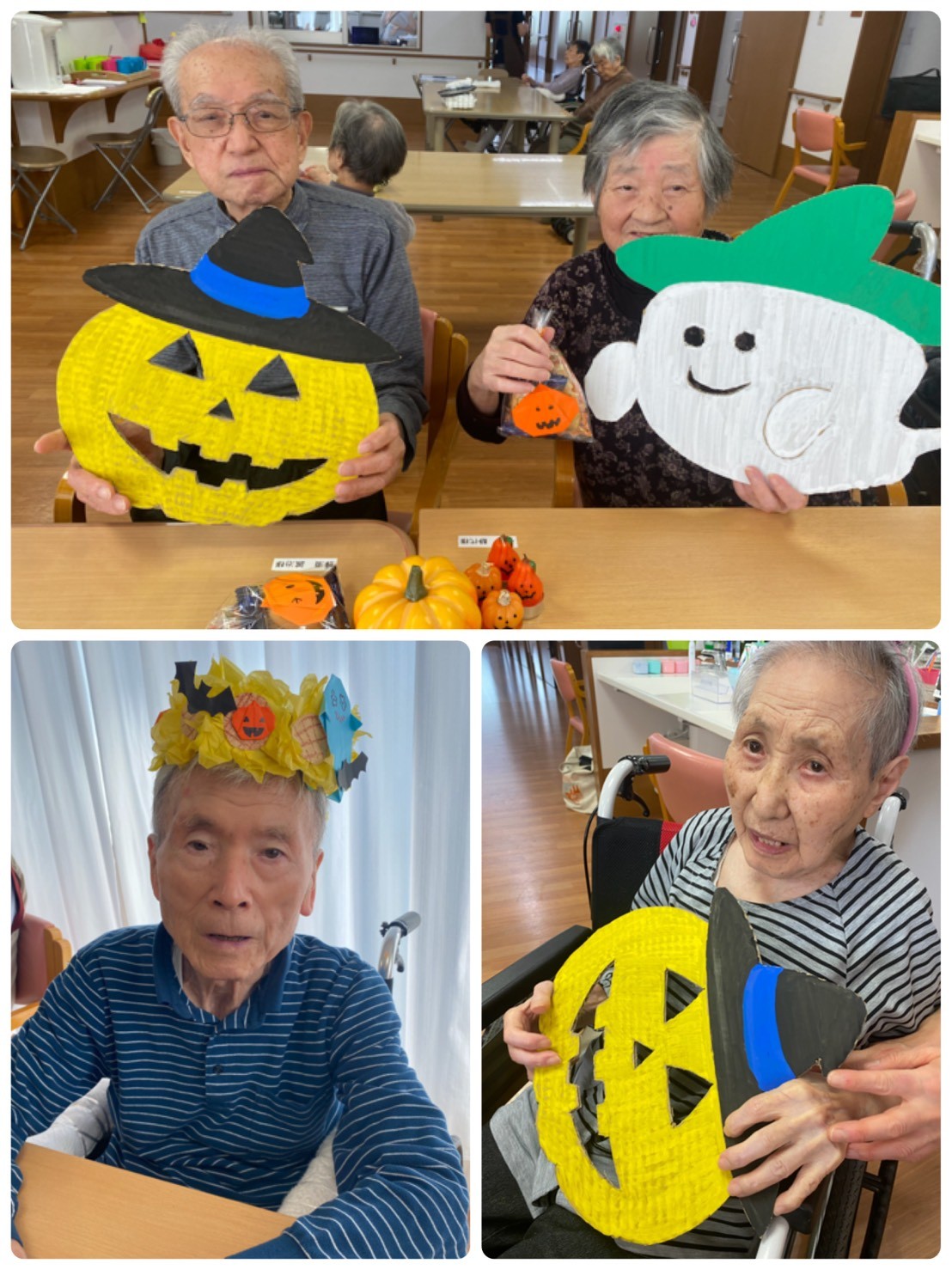 こんにちは。みんなの家・大宮内野本郷のコダマです(^。^) 花の丘公園そば。さいたま市西区。 宮原駅西口よりバス6分&徒歩4分のところにある施設です。 10月21日『ハロウィンパーティー♡』を開催しました(๑˃̵ᴗ˂̵) 美術が得意なWメンズスタッフが♡段ボールで一生懸命『おばけとかぼちゃ』を制作♬クオリティが高いですね〜☆ 施設から皆様へのプレゼント♡ お菓子の詰め合わせと『かぼちゃの和菓子』に・・・ 『中に白餡が入ってる!美味しいよ!』とテンション上がっていらっしゃいました(^。^)