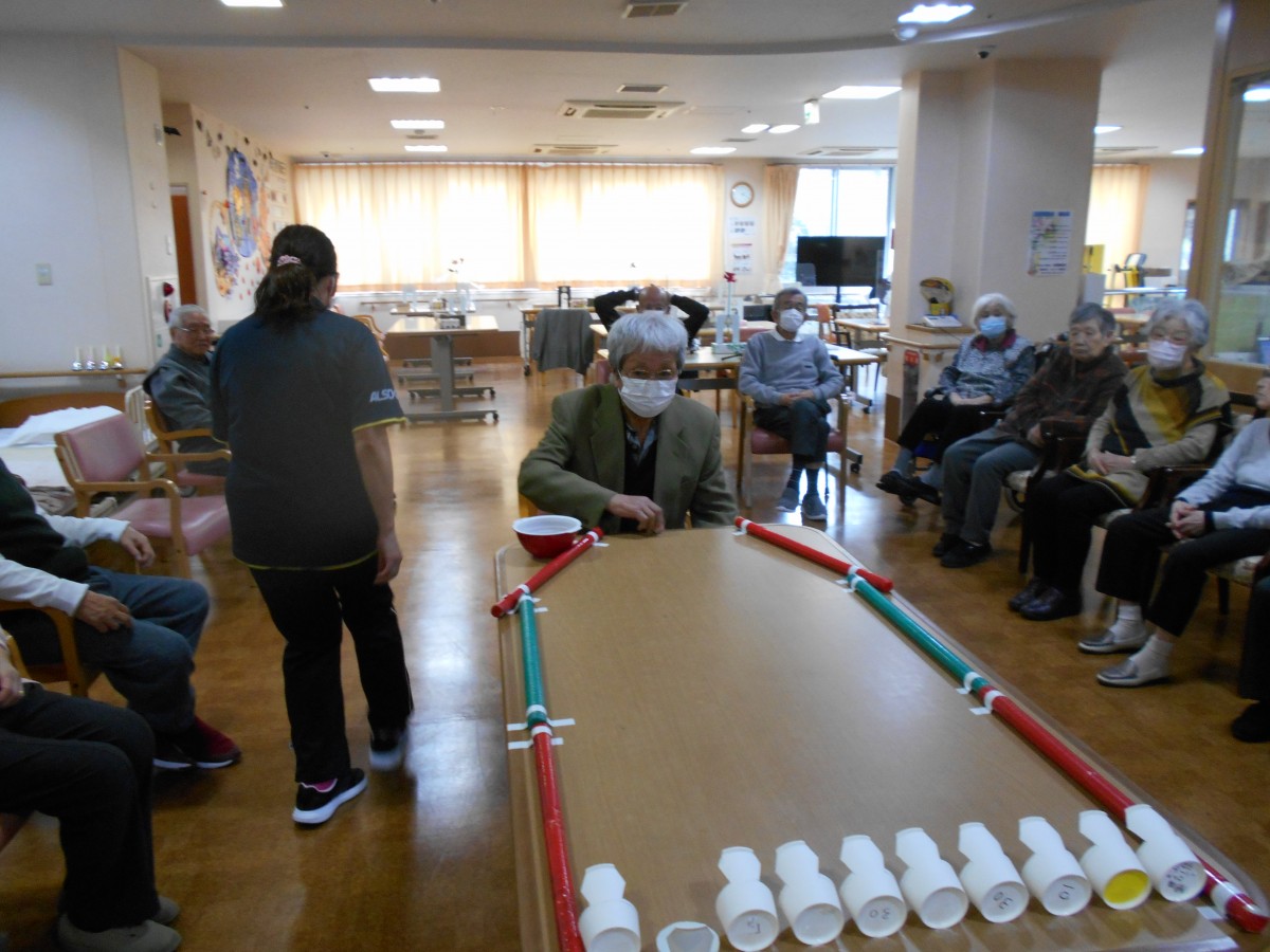 今回のレクリエーションはビー玉を転がして机の先についたカップに入れるというもの。