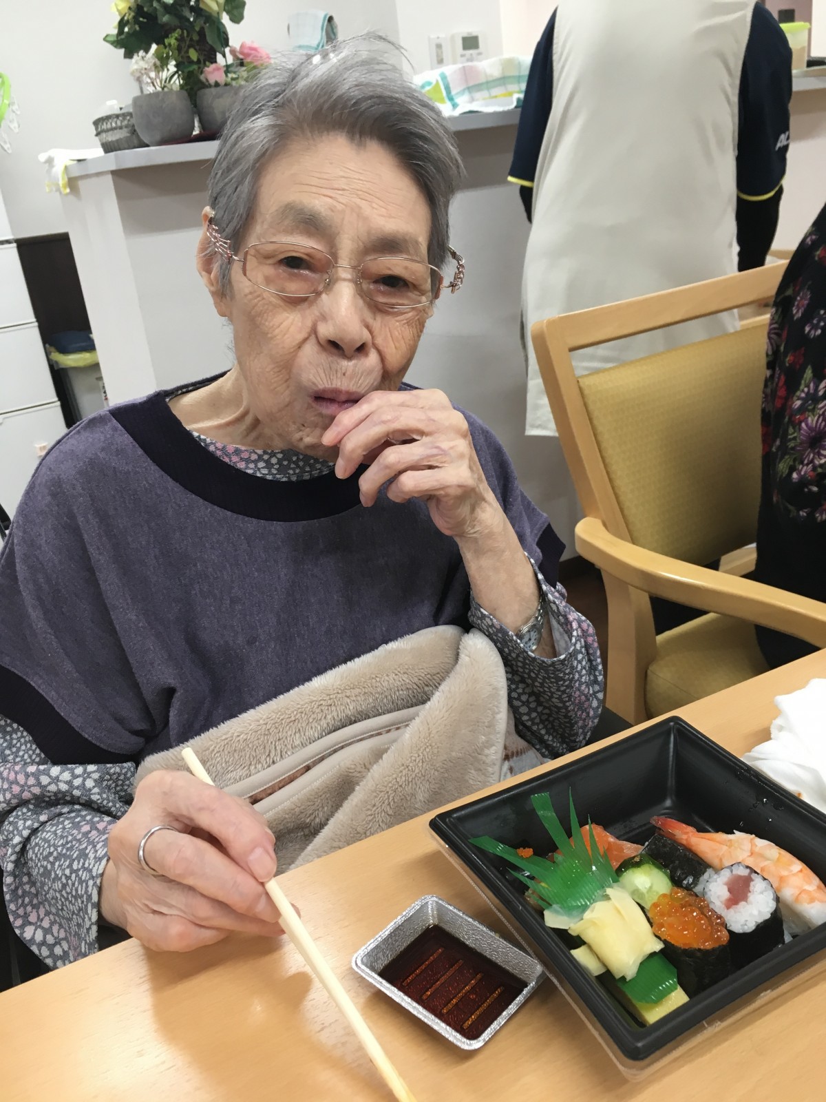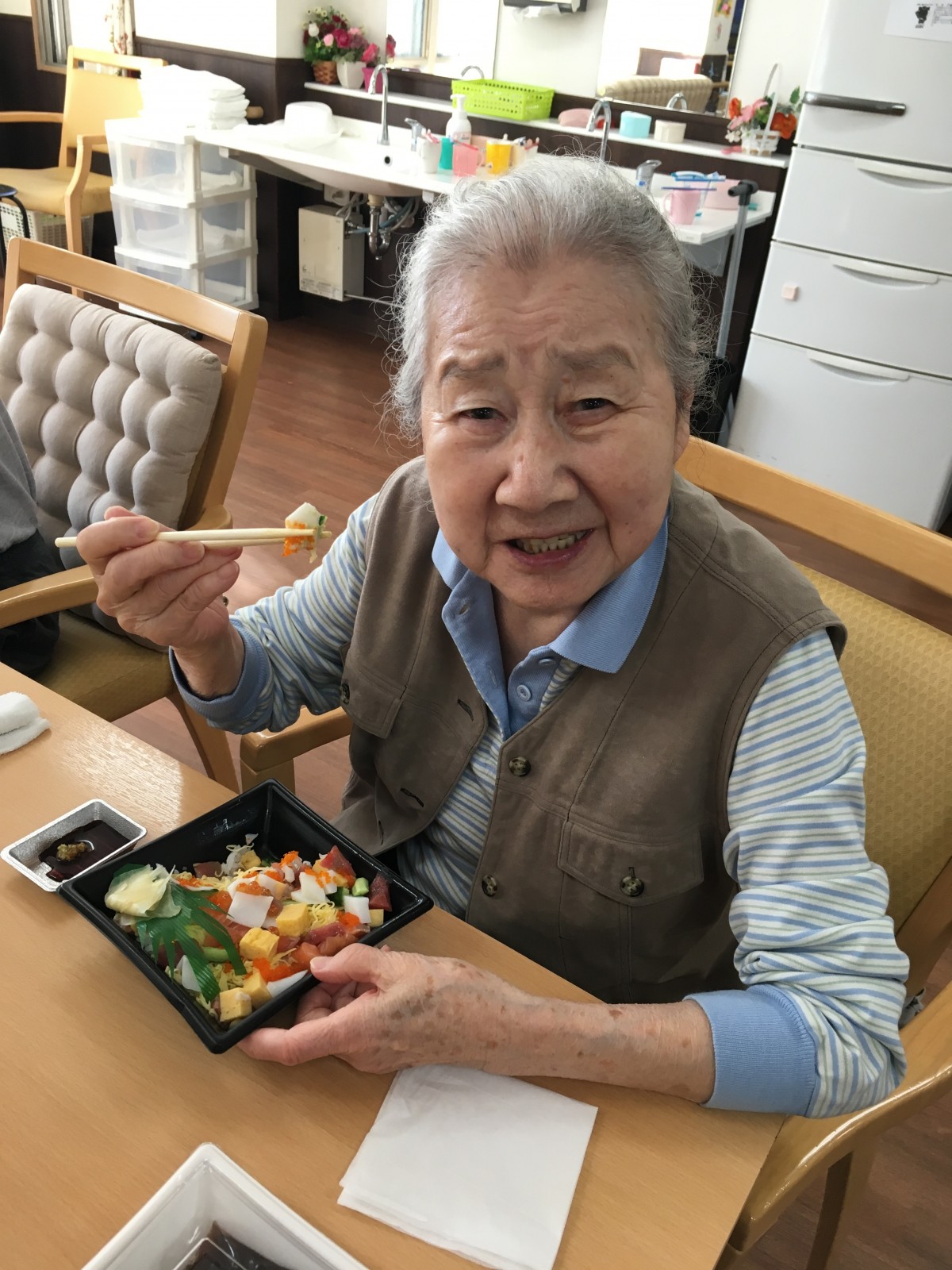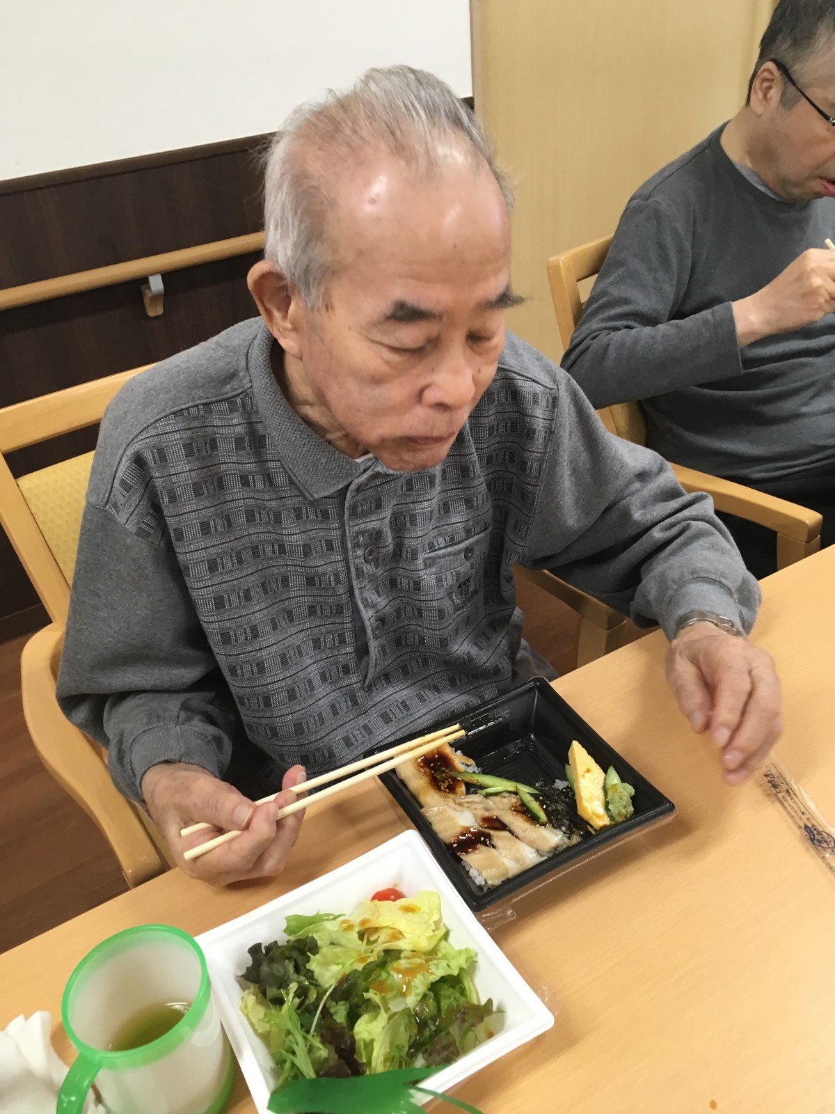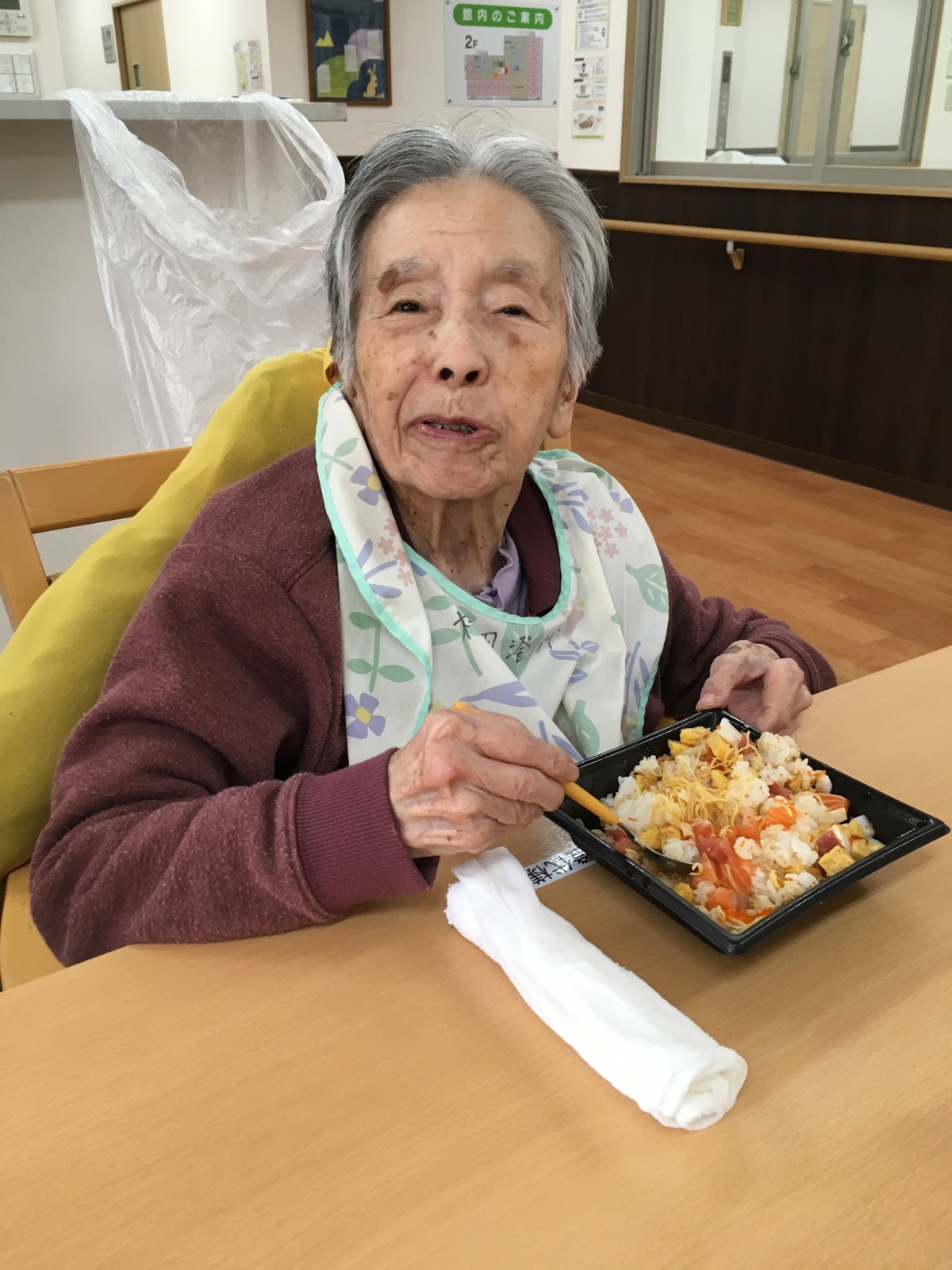 中には、普段なら食後に寝てしまう方がいるのですが、美味しいものを食べたせいか、覚醒し、興奮されていました。(美味しいものを食べると元気になるようです。)