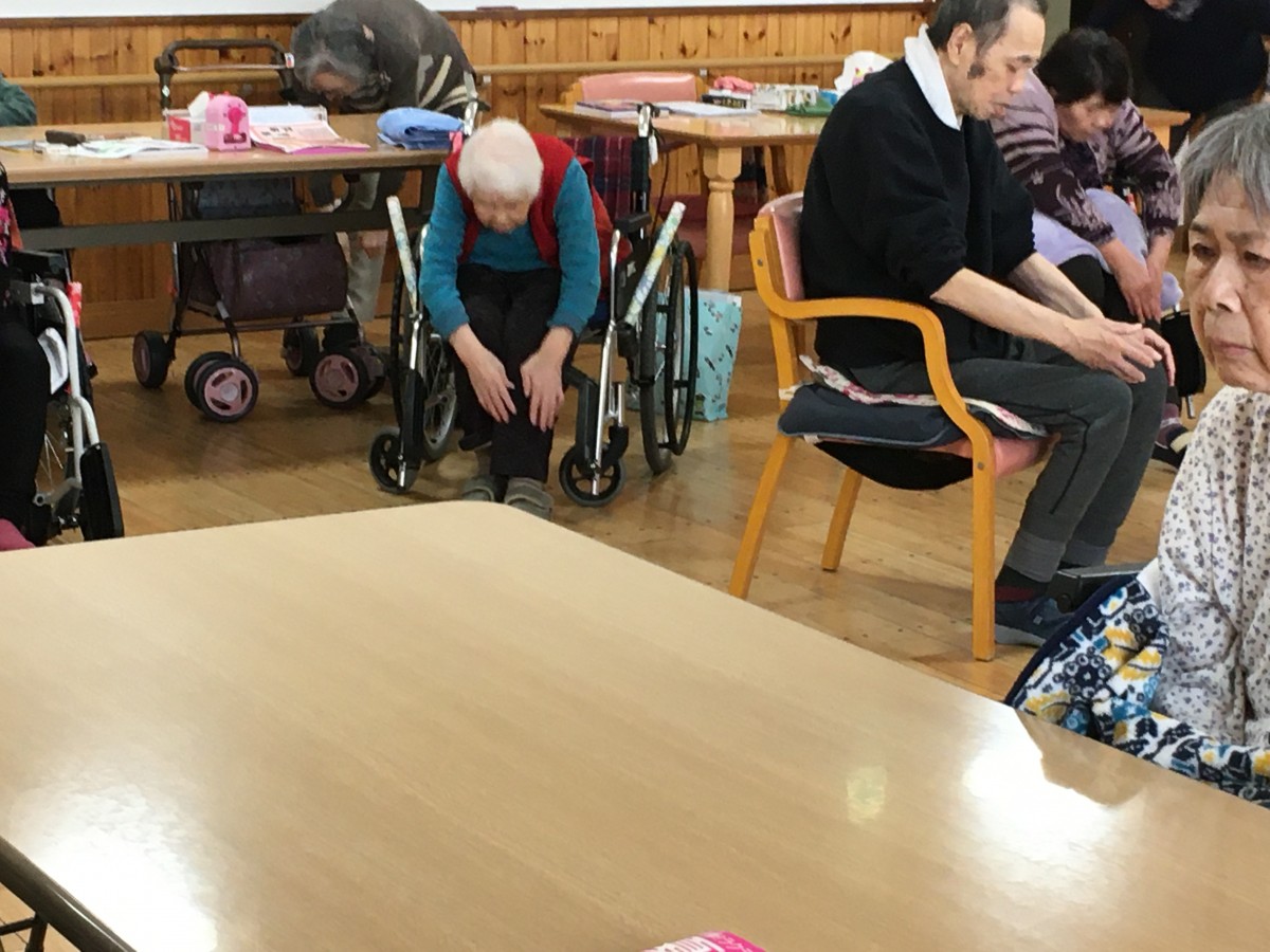 昼食前の時間、ご利用者様にお集まり頂いて、体操を行いました。