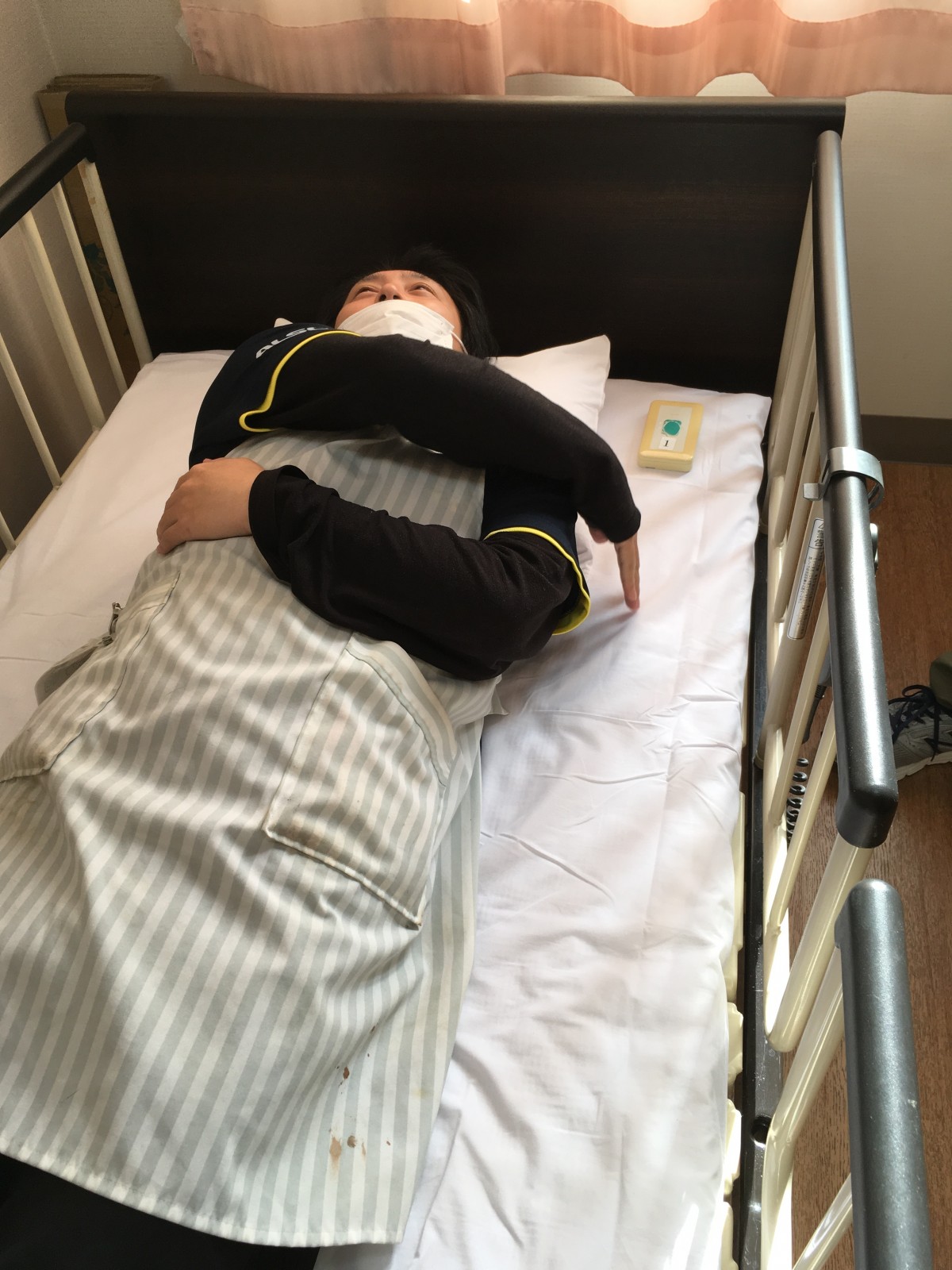 これも同じように左側の麻痺を想定しナースコールが届くか分からない場所に置きます。上の写真も同じですが4点柵にし降りれない様にされています。