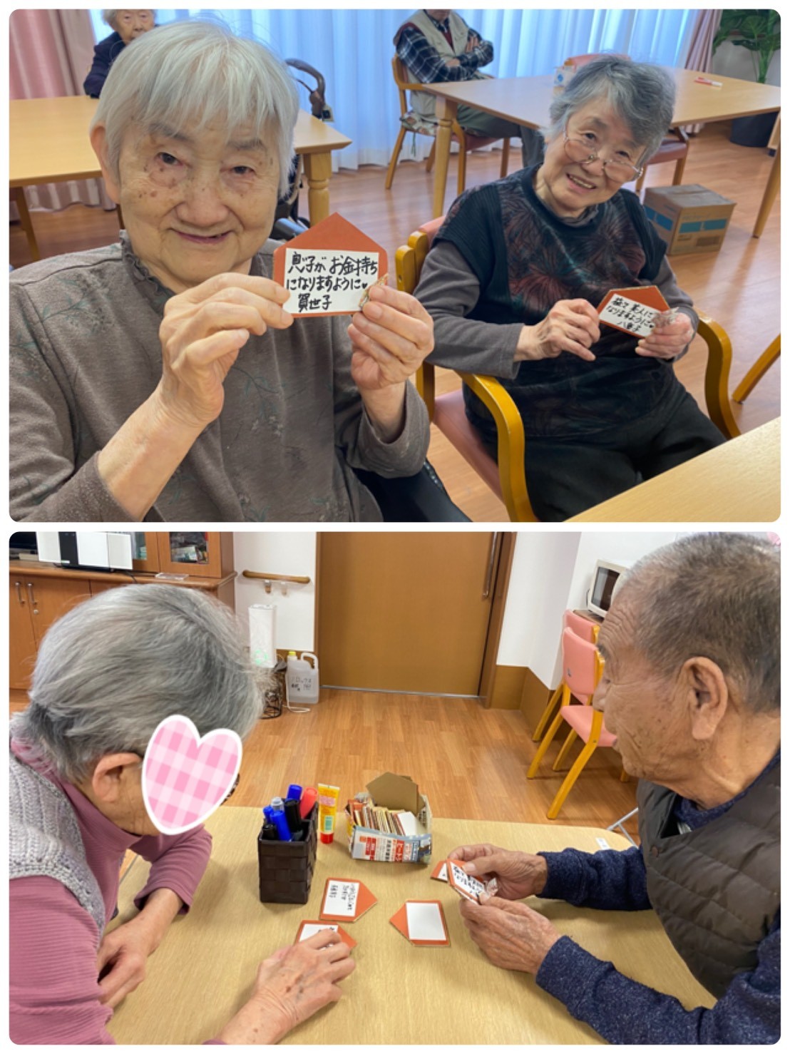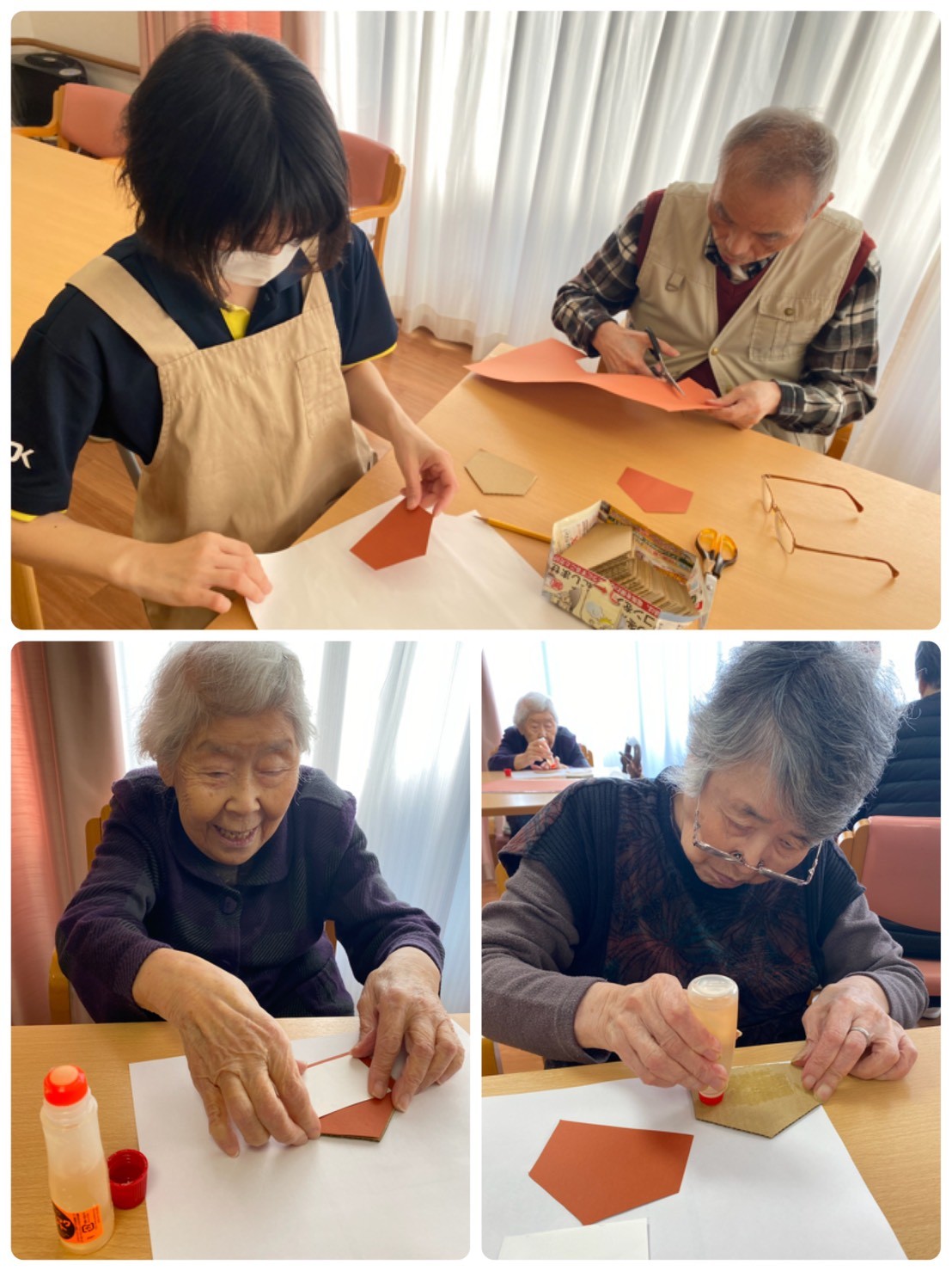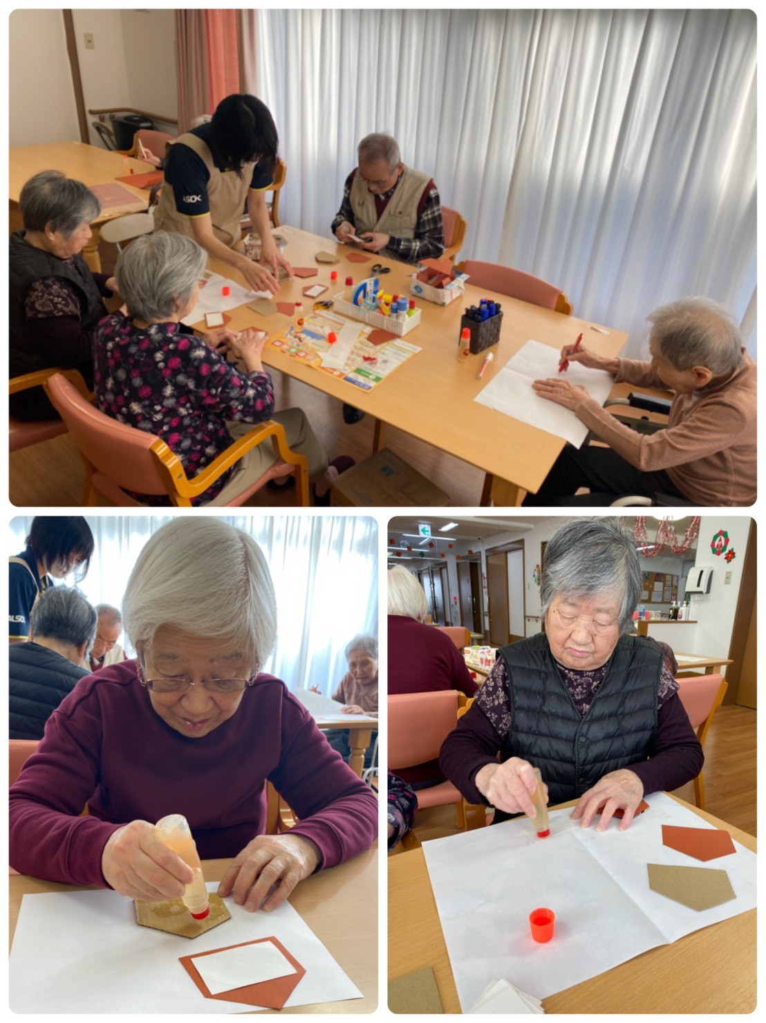 今年の漢字は『密』と発表になりましたね。来年はポジティブな漢字になるといいですね☆ まだまだコロナ禍でこのご時世初詣に行かれないので、今日は皆さまと一緒に『絵馬』作りをしました(๑˃̵ᴗ˂̵) 型紙を使って絵馬の形にハサミでカットしたり、色画用紙を糊付けする作業もやって頂きました♬折り鶴をボンド付けして完了〜♡ 『ウィルスが無くなったら買い物にも行きたいよね』『美味しいビールが飲みたい♬』←居酒屋レクで、かんぱ〜い♬しましょ。など、お話も盛り上がりました(^ ^) 壁画で飾ろうと思います☆