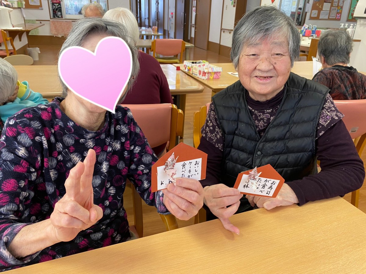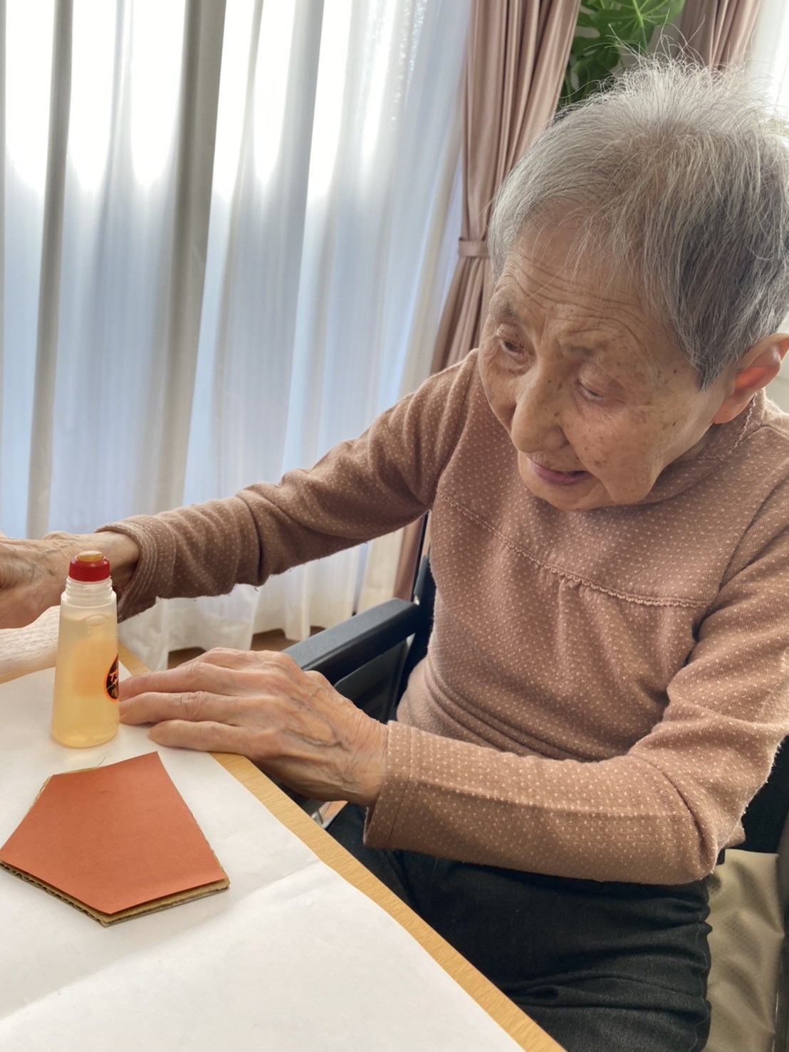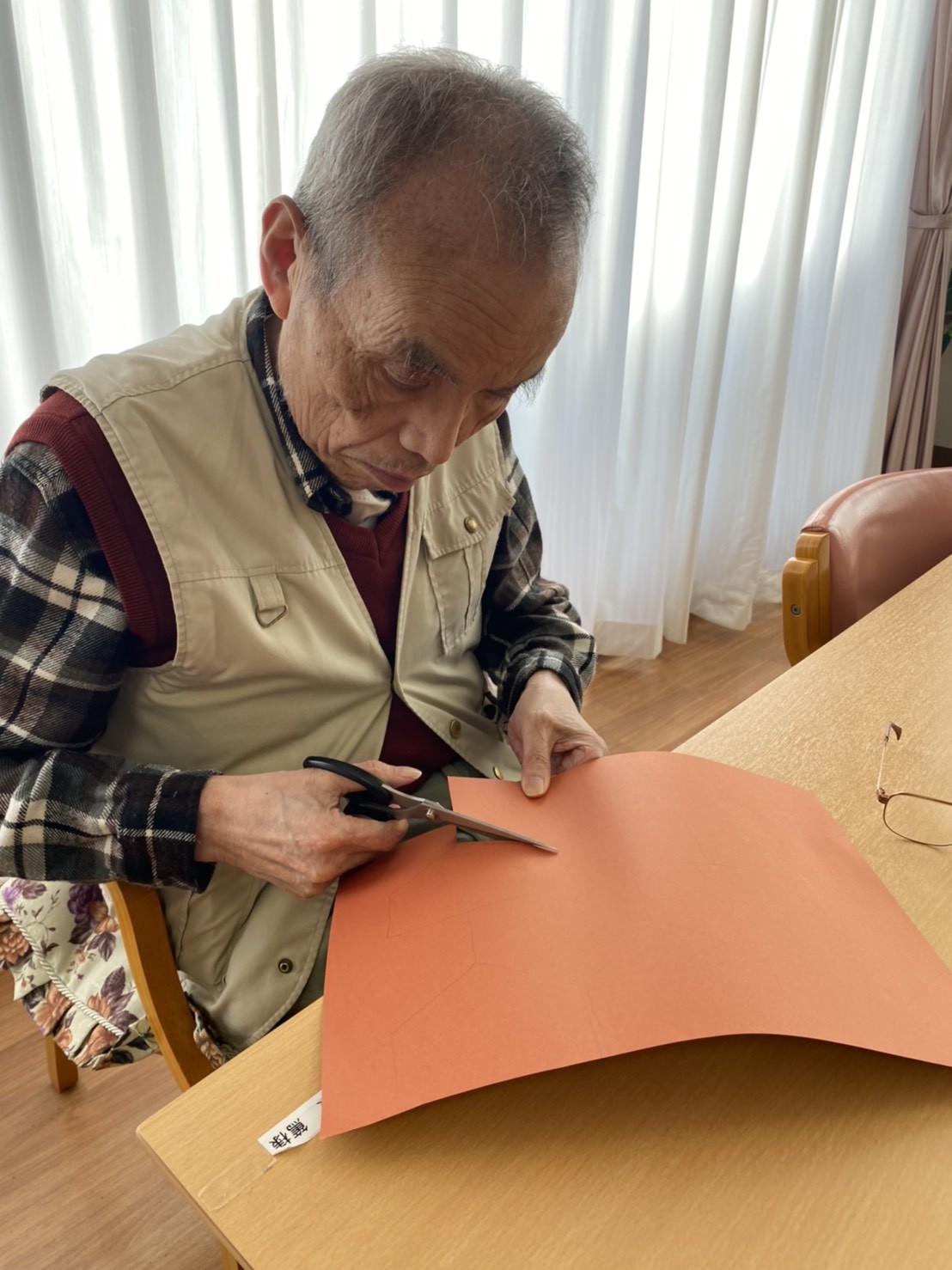 今年の漢字は『密』と発表になりましたね。来年はポジティブな漢字になるといいですね☆ まだまだコロナ禍でこのご時世初詣に行かれないので、今日は皆さまと一緒に『絵馬』作りをしました(๑˃̵ᴗ˂̵) 型紙を使って絵馬の形にハサミでカットしたり、色画用紙を糊付けする作業もやって頂きました♬折り鶴をボンド付けして完了〜♡ 『ウィルスが無くなったら買い物にも行きたいよね』『美味しいビールが飲みたい♬』←居酒屋レクで、かんぱ〜い♬しましょ。など、お話も盛り上がりました(^ ^) 壁画で飾ろうと思います☆