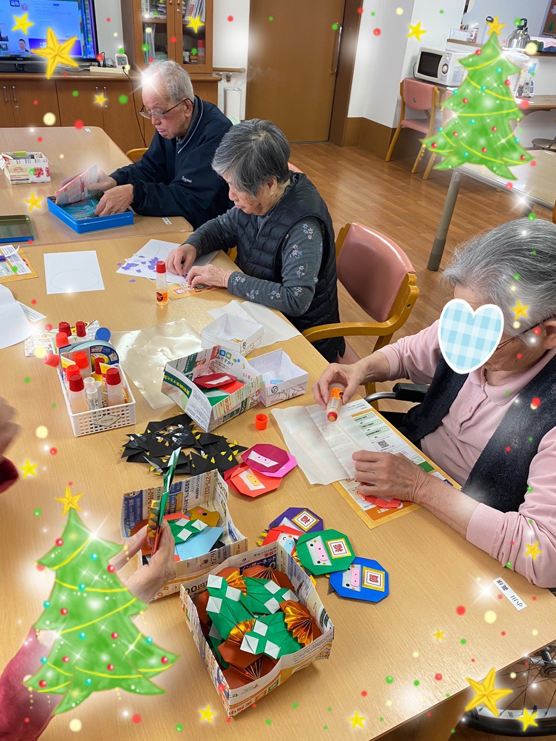 ◉スタッフと一緒に、丑だるまや梅の花など『お正月らしい作品』を折り紙で折る。