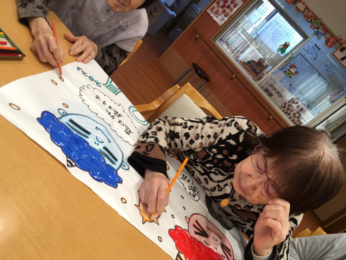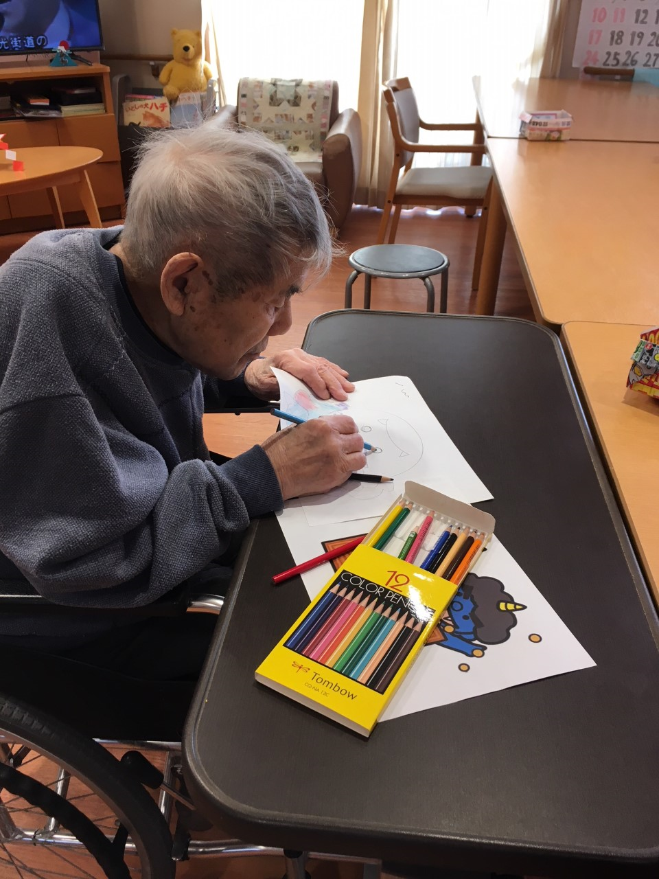 ちょっと早いのですが、節分の鬼の塗り絵を始めました。色をつけたら今度はそこに紙を貼って貼り絵になるのですよ。