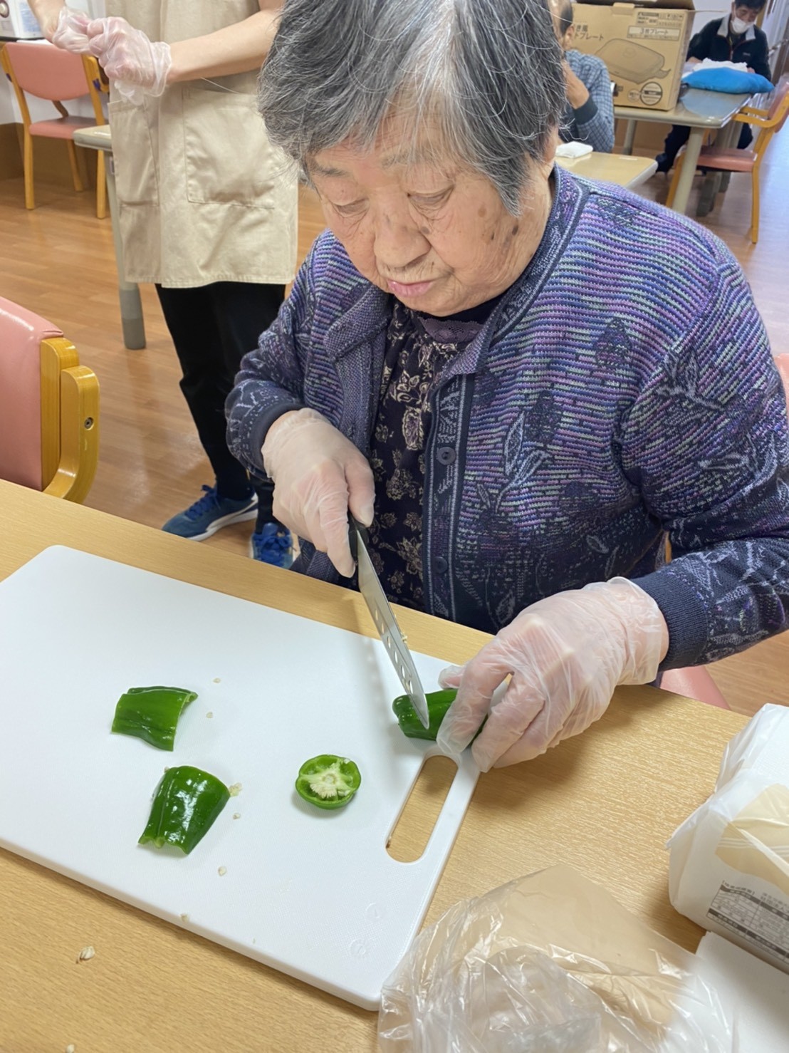 ◉ピーマンとハムを包丁でカットしていただく。