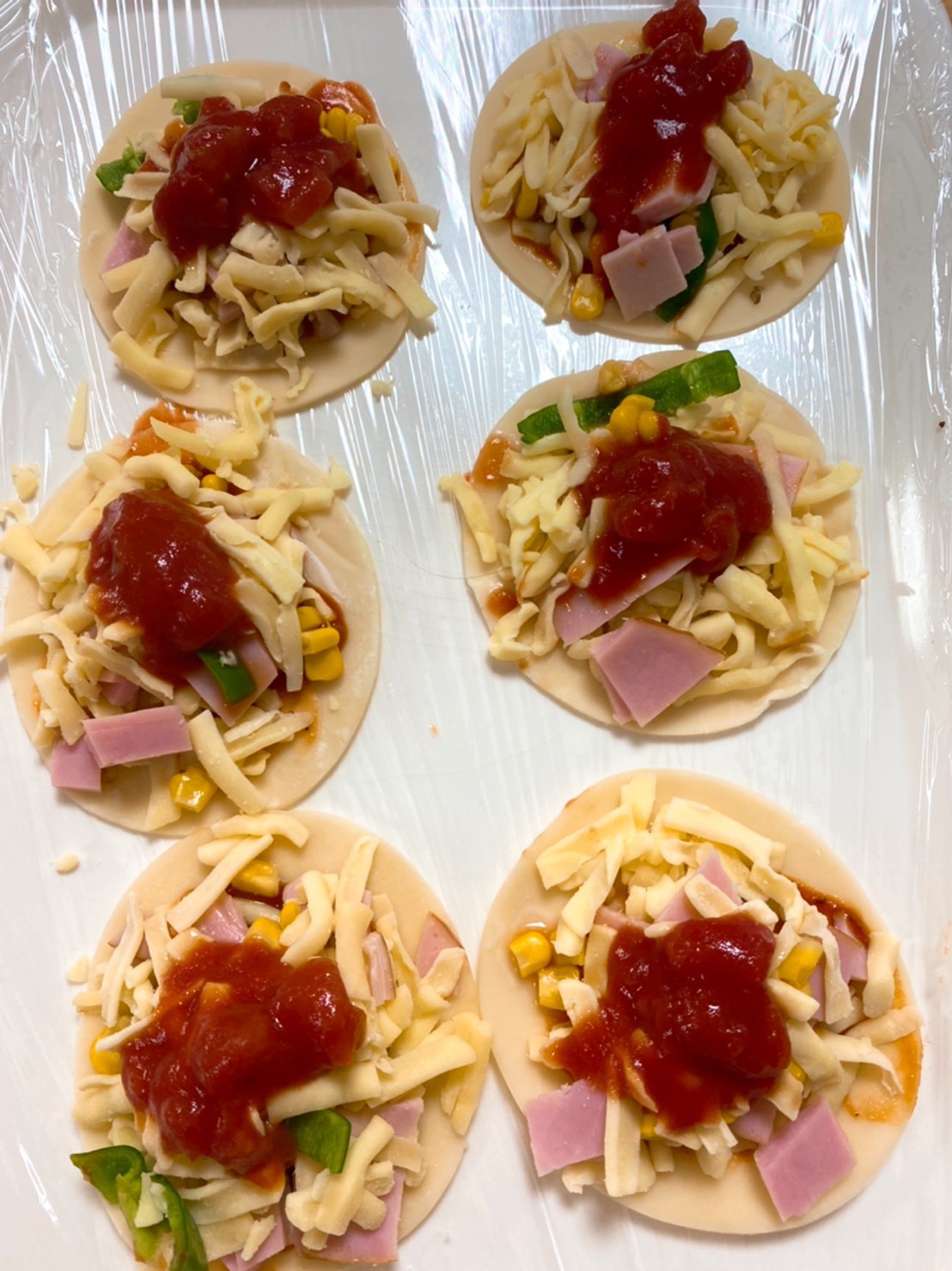 ◉コーン・ピーマン・野菜・とろけるチーズなどお好きにトッピングする。