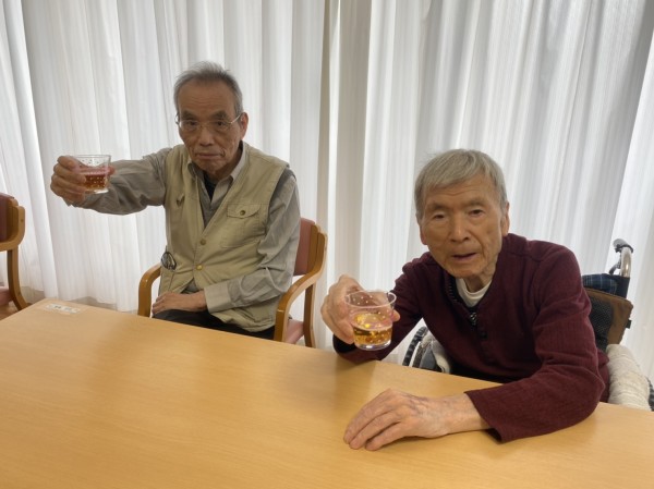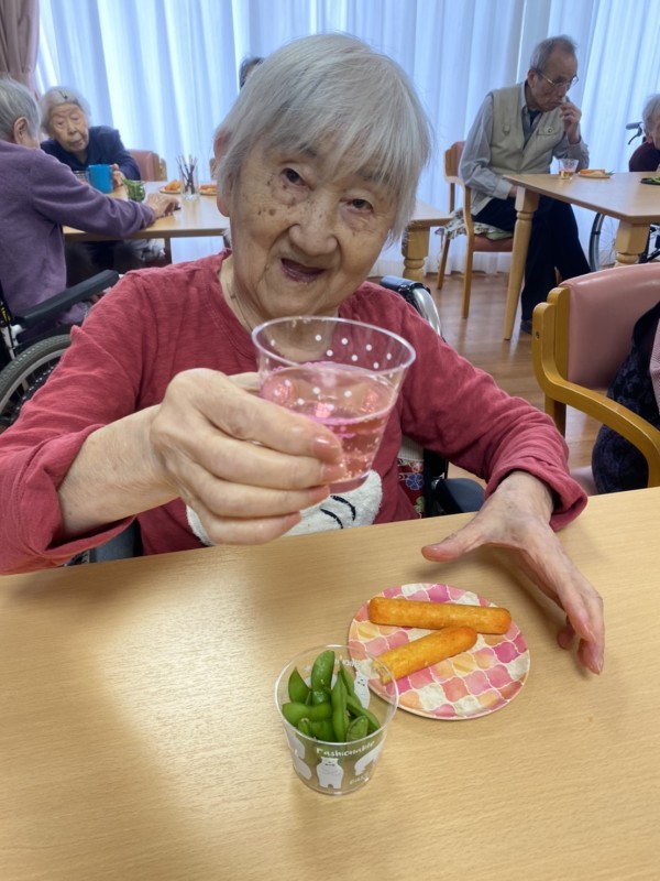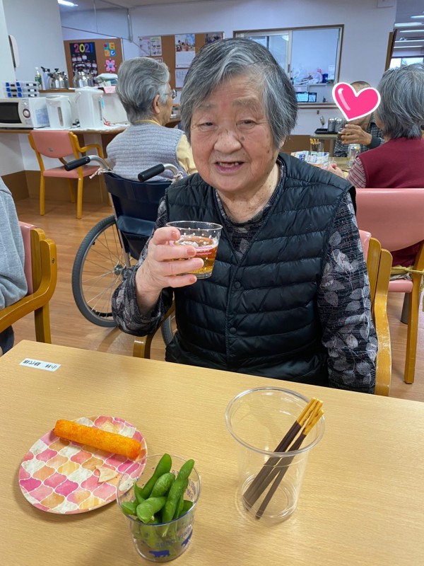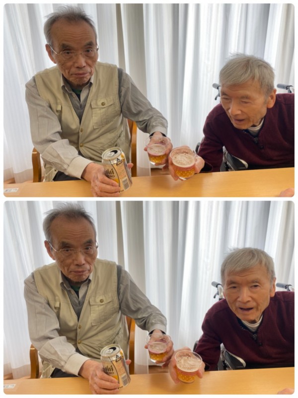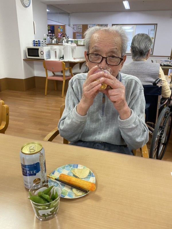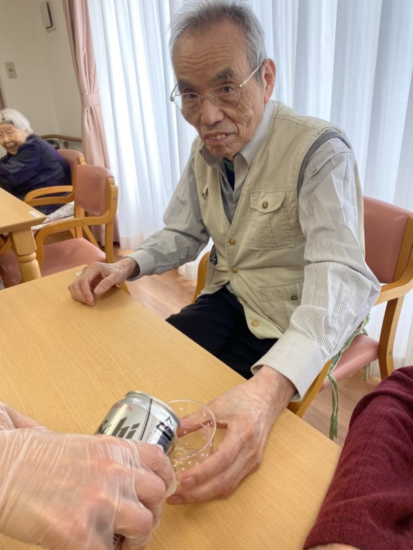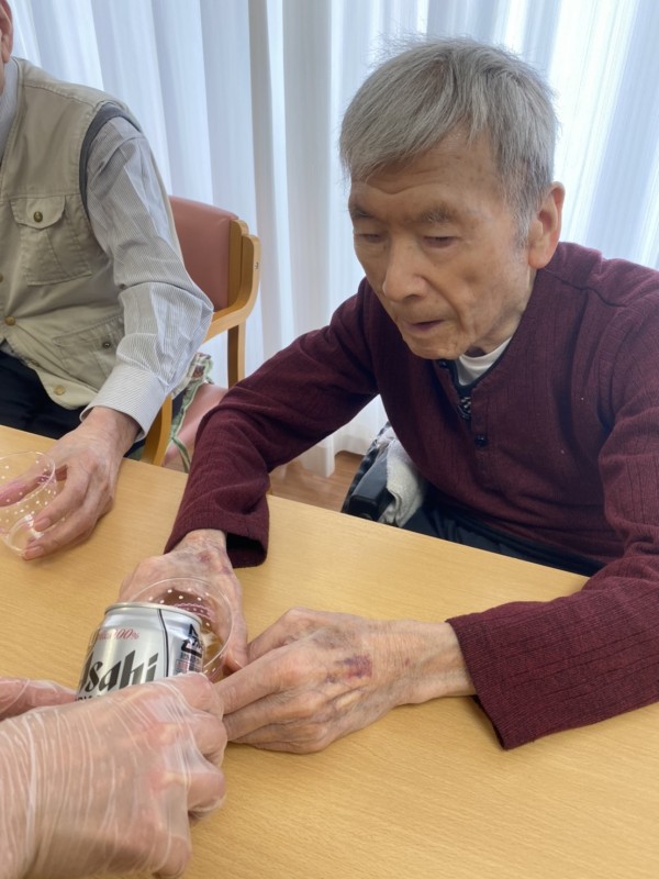 男性入居者様方には特に喜ばれています♡♡♡ コロナ禍の為、一階と二階と別々に開催しました。 ノンアルコールビールやサワーで