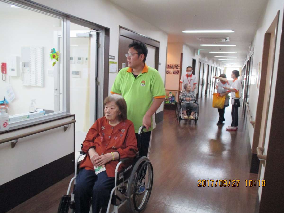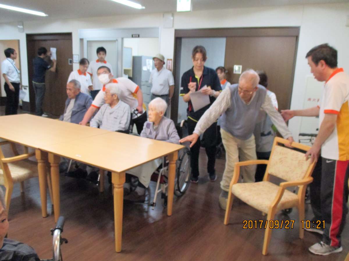 介護職員の付き添いで、ご自分で歩かれる方も車いすの方もみんなで避難しました。全員避難までの時間はなんと9分37秒。(施設新記録)