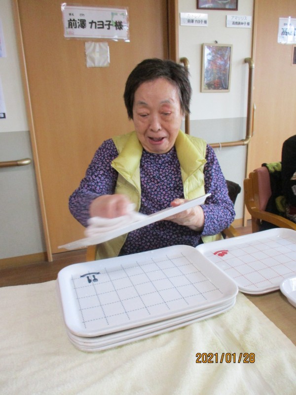 テーブルにて、ふきん・お盆を用意して、スタンバイしています。