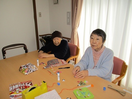 2階の入居者様もスタッフと一緒にひな祭りに向けて作業を始めました(*^^*) 折り紙で折った雛人形など赤い紐に付けて…