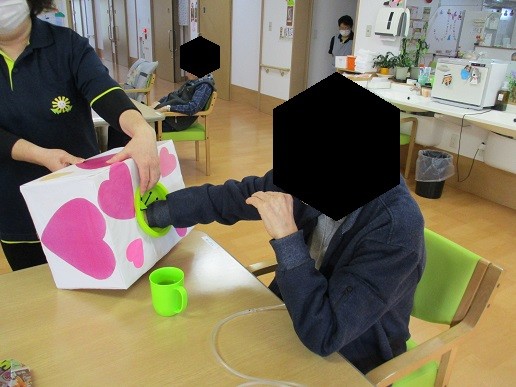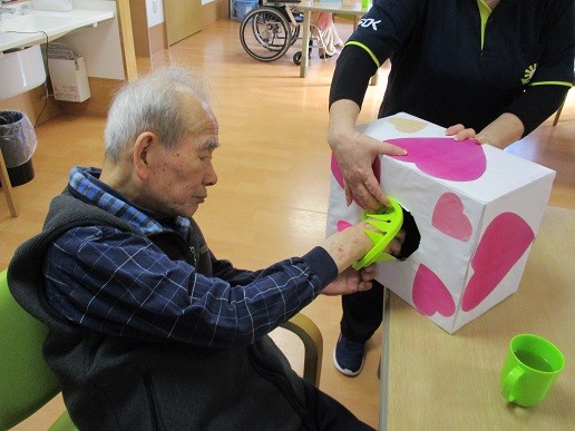 スタッフお手製の箱に入居者様の手を入れてガサゴソ…