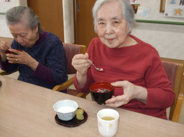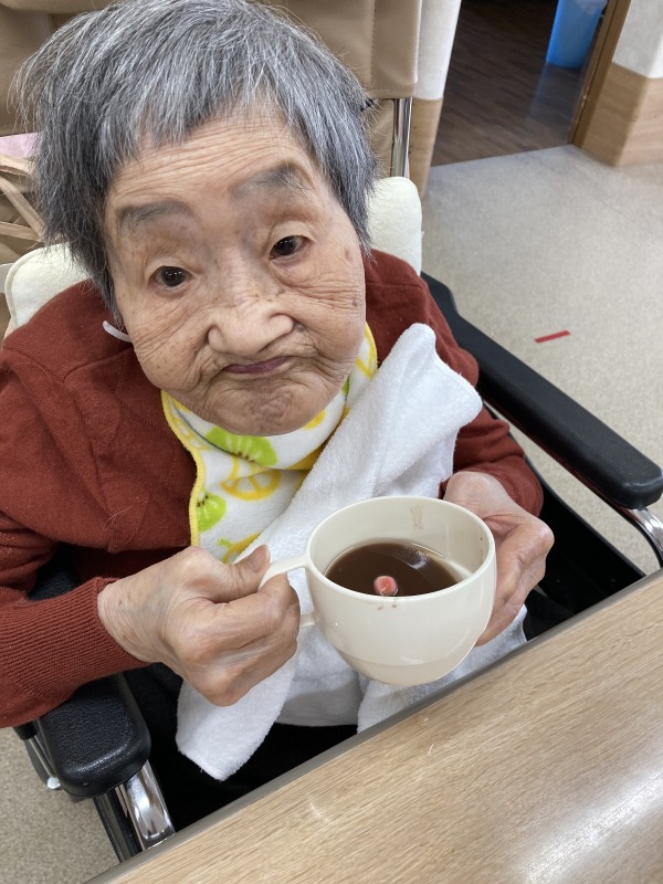 思い切り、楽しく歌った後は、「あま~いおしるこのおやつですよ~。」とお声をかけると、